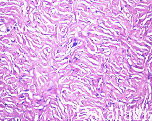3. 镜下可见漩涡状或席纹状排列的粗大胶原纤维,纤维之间为含有较多黏液的宽裂隙,AB 染色阳性;