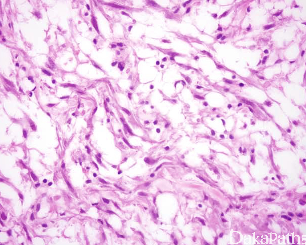 常见黏液性间质、少细胞区伴有丰富的毛细血管网以及局灶致密的胶原变性等组织学特征,偶见间质钙化;