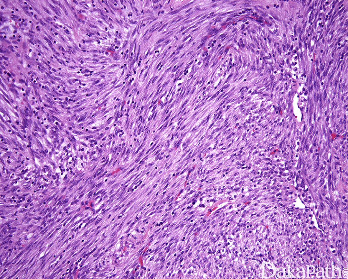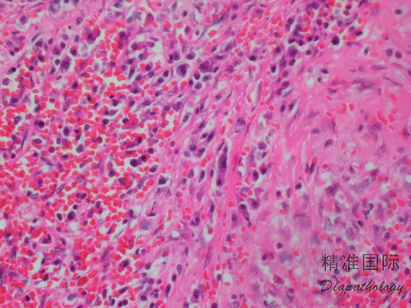 梭形细胞可见致密的席纹状或束状排列仅见少量的炎细胞浸润,亦可表现为广泛的炎性背景仅有少数梭形肿瘤细胞;
