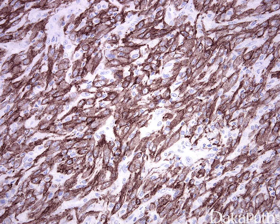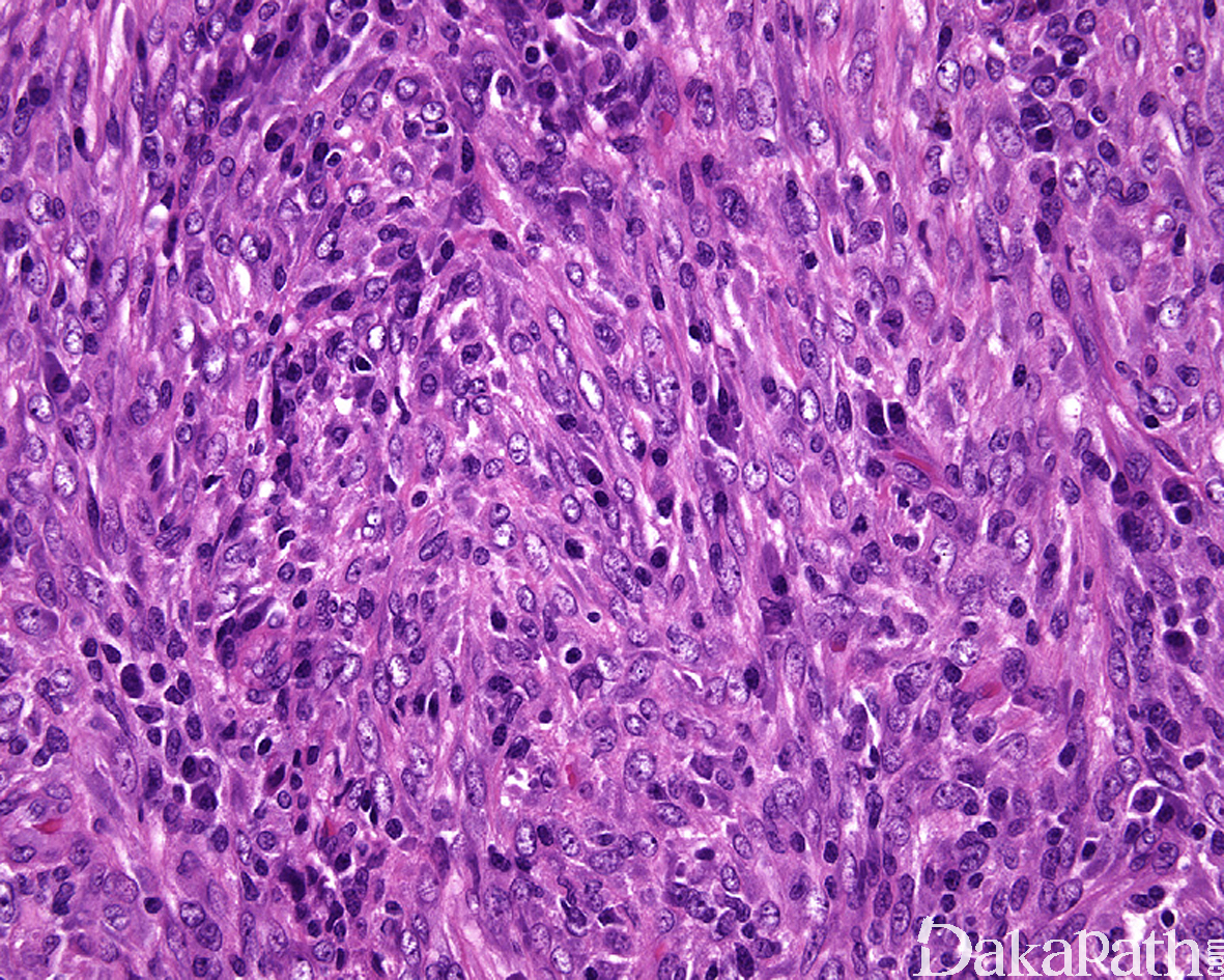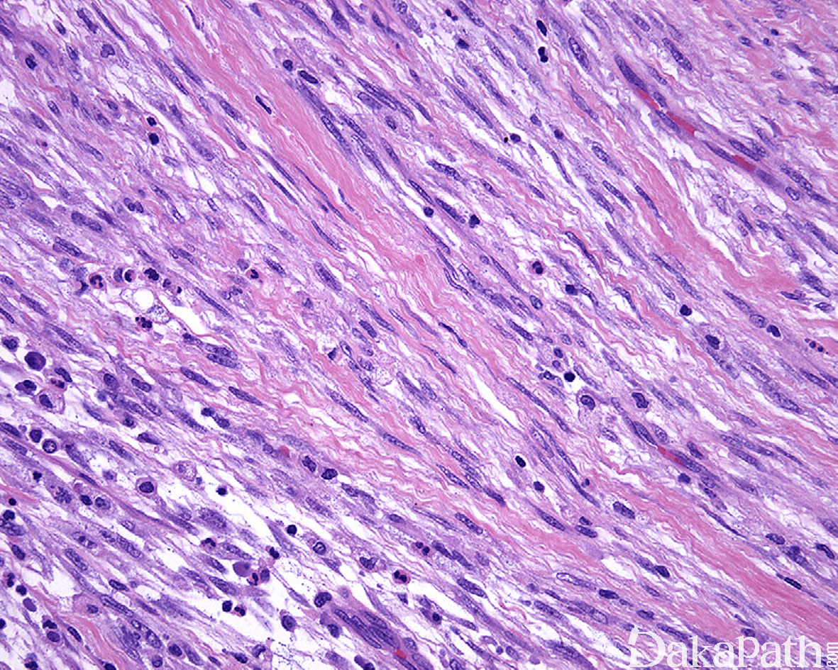 梭形瘤细胞通常具有卵圆形至伸展的核,小而显著的嗜酸性核仁以及较丰富的双嗜性胞浆,有时候类似于萎缩的横纹肌细胞或神经节细胞;