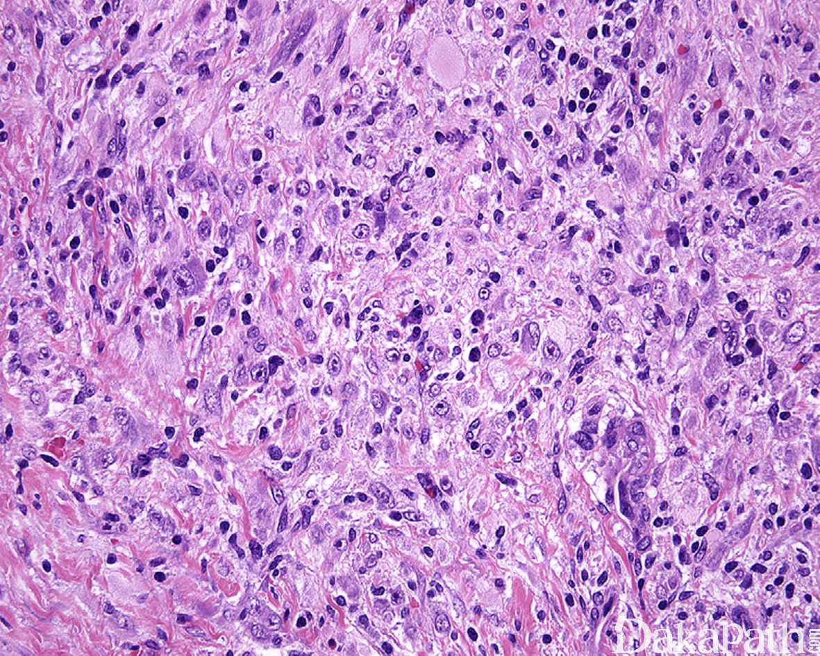 - 炎症性恶性纤维组织细胞瘤(未分化多形性肉瘤) :多发生于成年人,好发于腹膜后。由畸形的多形性细胞组成,有时瘤细胞可被大量的黄色瘤细胞和炎症细胞所掩盖,免疫组化染色 ALK 阴性,SMA、desmin 常阴性。