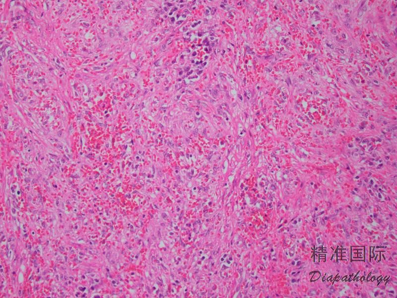 6 .结节性筋膜炎: 常发生于四肢,病变通常较小,快速生长,黏液性背景较丰富,炎症较 IMT 稀疏,以组织培养样细胞为主,罕见神经节细胞样细胞,USP6 基因重排阳性,ALK(-)。