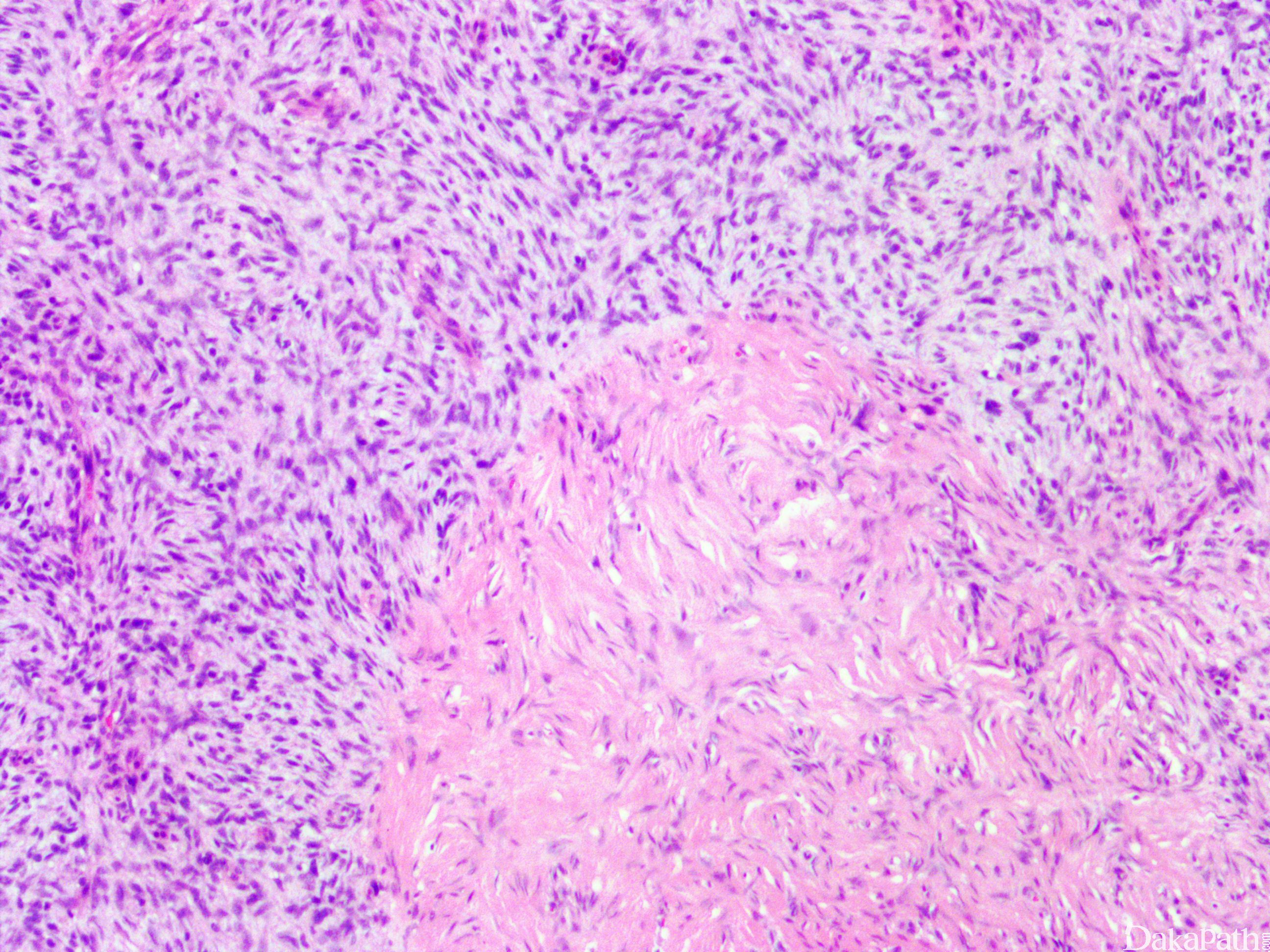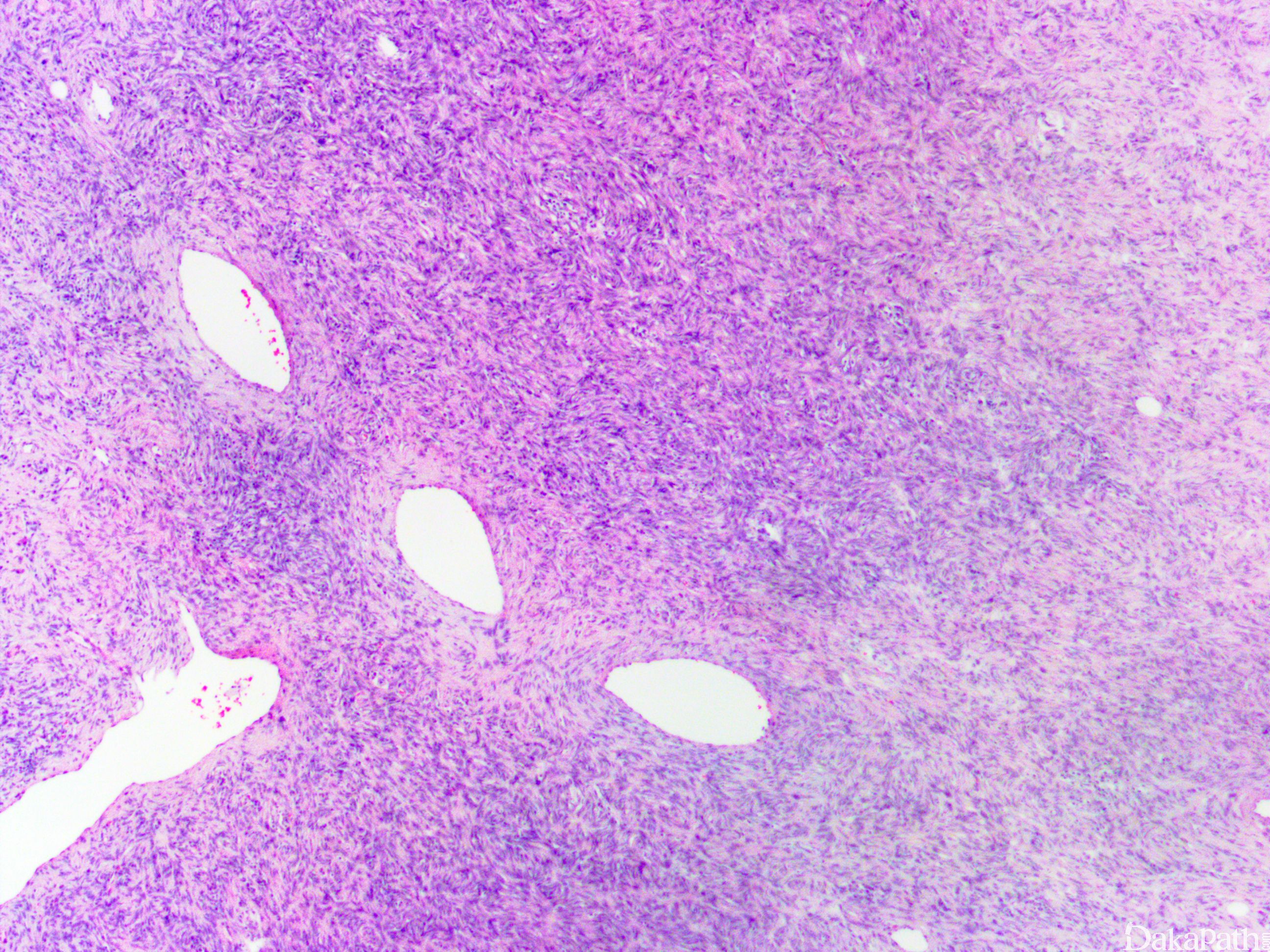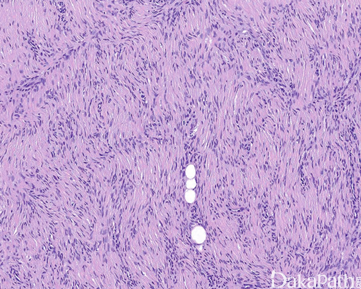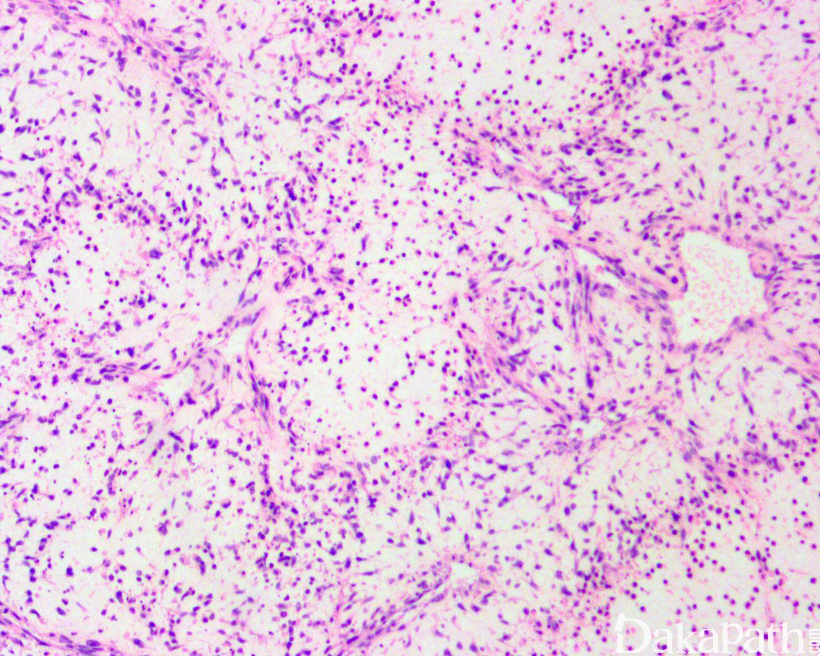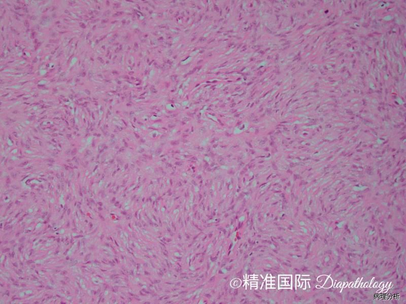 12. 部分病例可见瘤细胞的区域性分布表现为富于细胞区过渡为具有丰富的玻璃样胶原性间质的低密度区,当胶原基质较多时瘤细胞可呈类似于神经鞘瘤可见的栅栏状核排列;