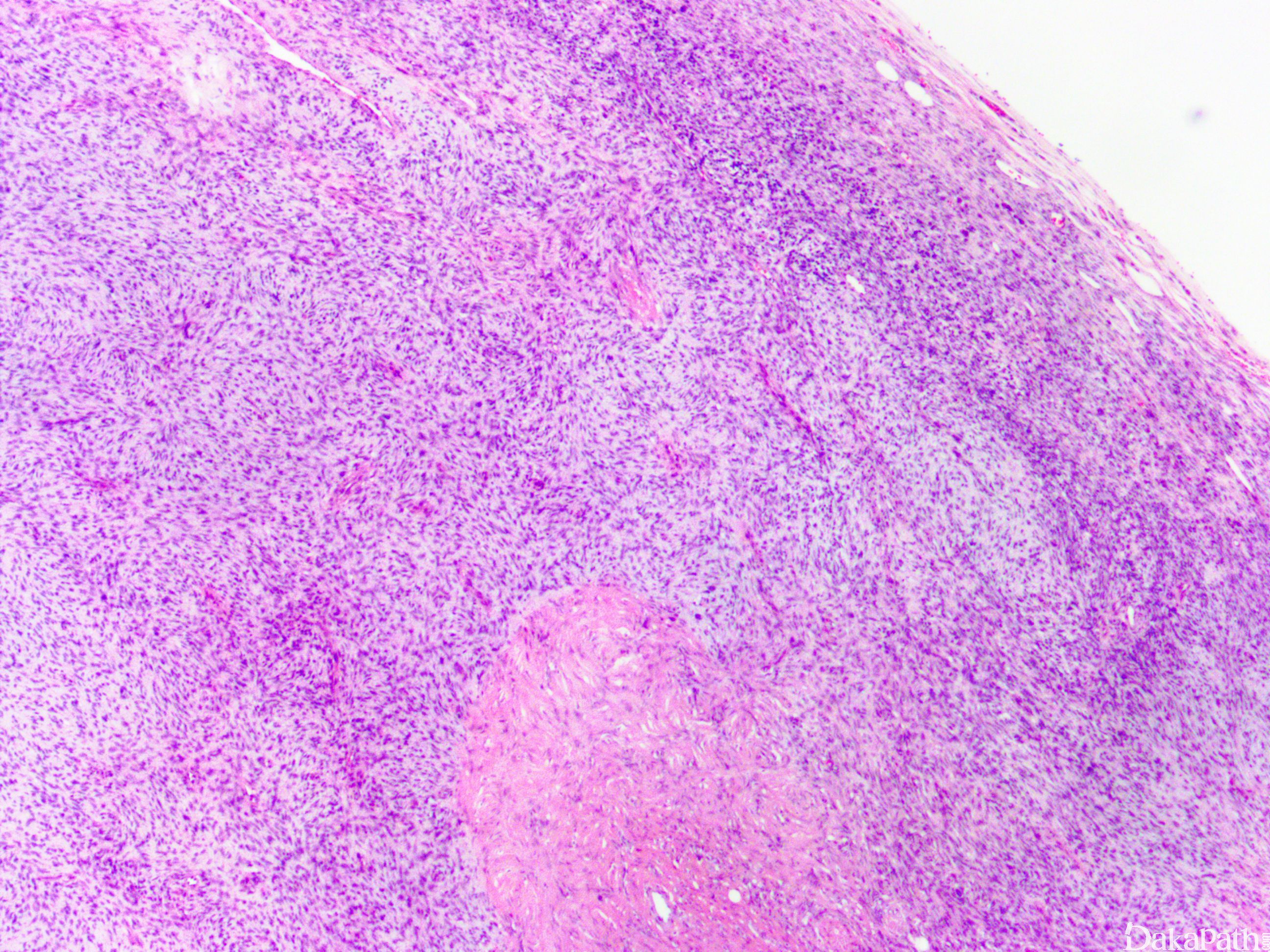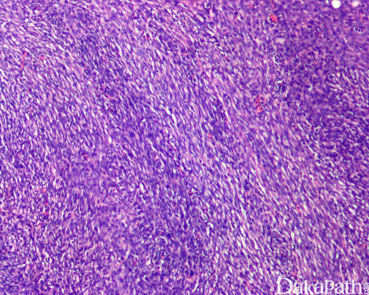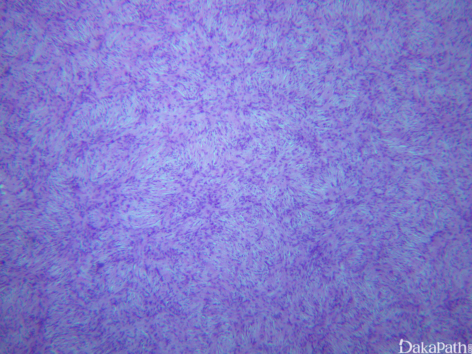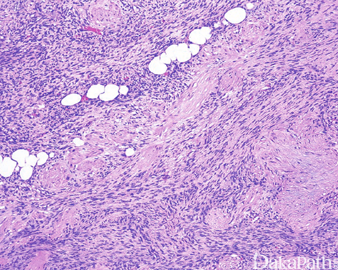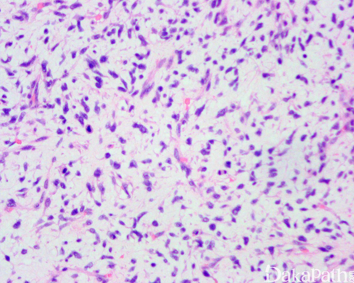 12. 部分病例可见瘤细胞的区域性分布表现为富于细胞区过渡为具有丰富的玻璃样胶原性间质的低密度区,当胶原基质较多时瘤细胞可呈类似于神经鞘瘤可见的栅栏状核排列;