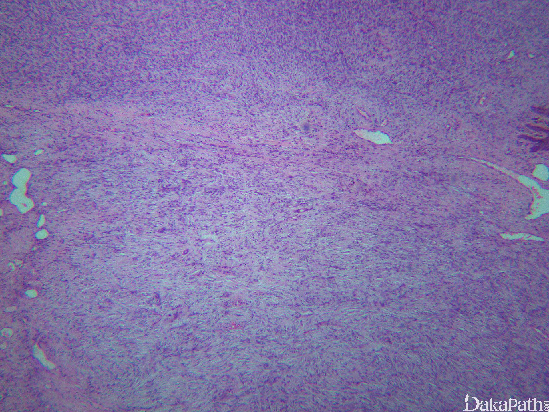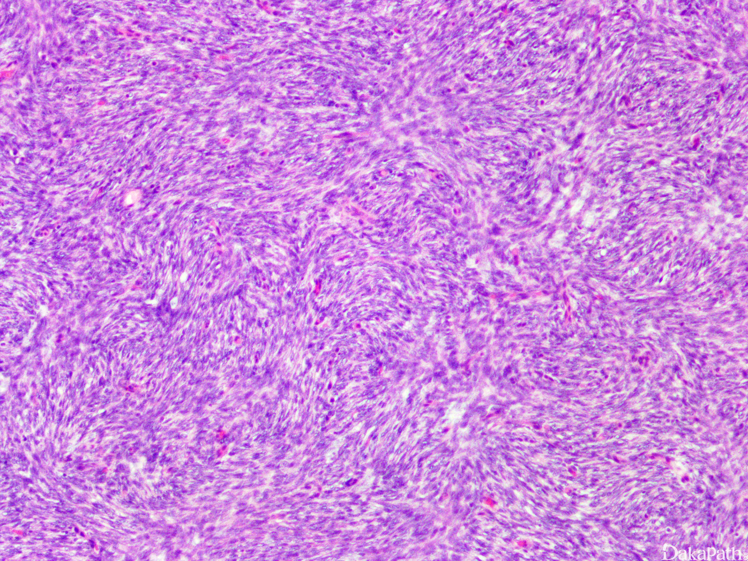5. 瘤细胞均匀较一致,呈两端细长的纤维母细胞样,呈一致的致密的席纹状排列,少数病例内可见局灶的血管外皮瘤样排列;