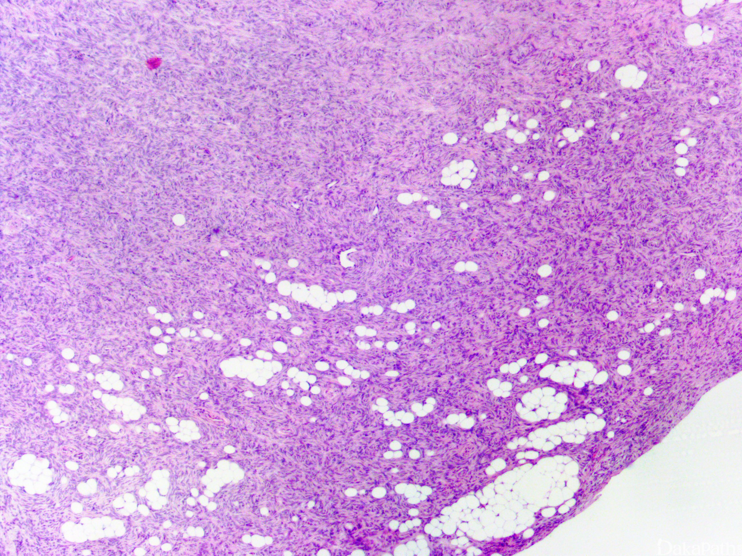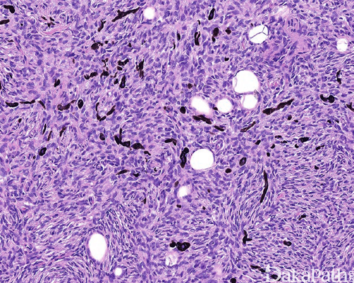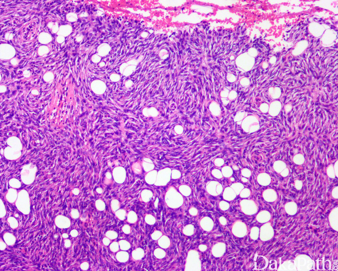 黏液纤维肉瘤:黏液变异型 DFSP 需要与黏液纤维肉瘤区别;黏液纤维肉瘤瘤细胞的异型性更明显,常见血管周围聚集和假脂肪母细胞