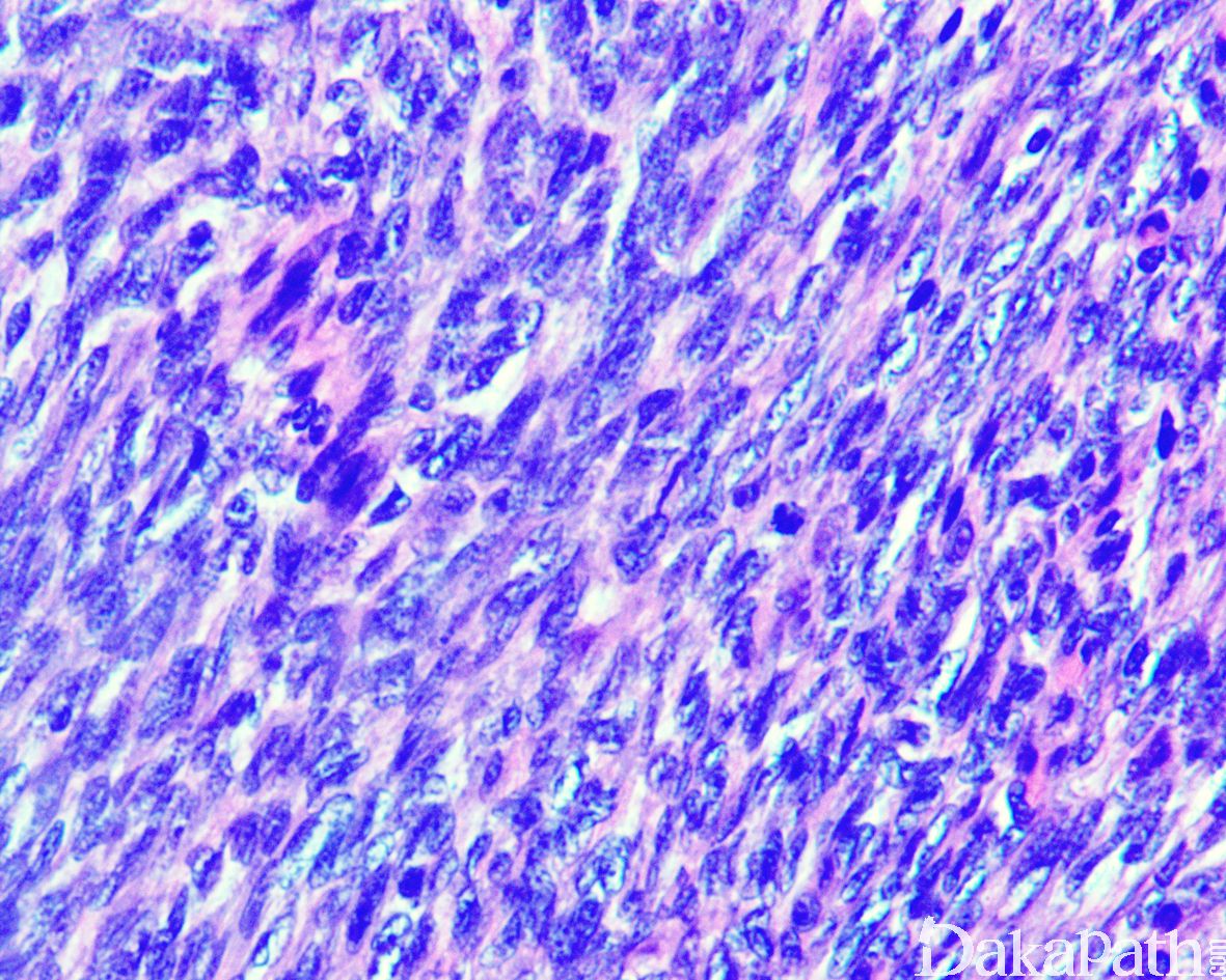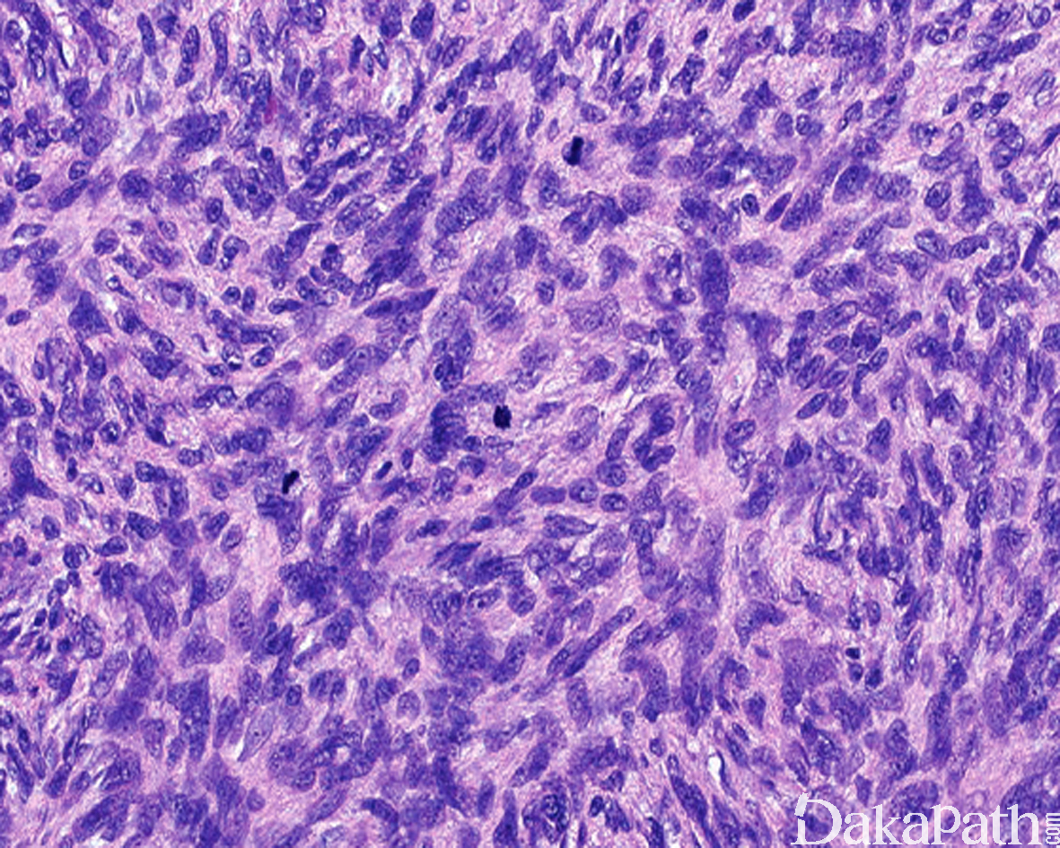 14. 约 10%的 DFSP 可见高级别转化,表现为瘤细胞密度高,呈长束状或鱼骨样排列,组织学上类似于成人型纤维肉瘤,又称为 DFSP 伴有纤维肉瘤样转化,纤维肉瘤样转化灶通常位于皮下,瘤细胞可见较大的异型性和明显增高的核分裂象,约 1%可见 DFSP 转化为明显的多形性瘤细胞特征,类似于多形性未分化肉瘤;