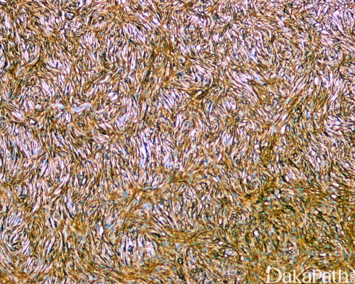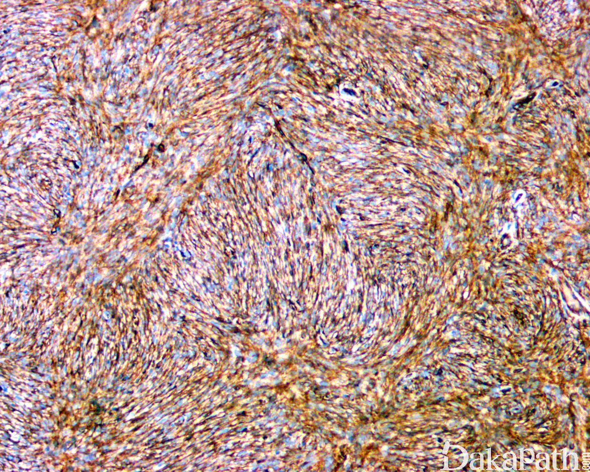 DFSP 通常表达 CD34,不表达 S100 蛋白,EMA, CK, FXIIIa, desmin 和 CD117, 部分可局灶表达 SMA;伴有纤维肉瘤样转化的 DFSP 转化区 CD34 表达减少,过表达 P53;富于黑色素的梭形或树突状细胞表达 HMB45. Melan-A 和 S100 蛋白。