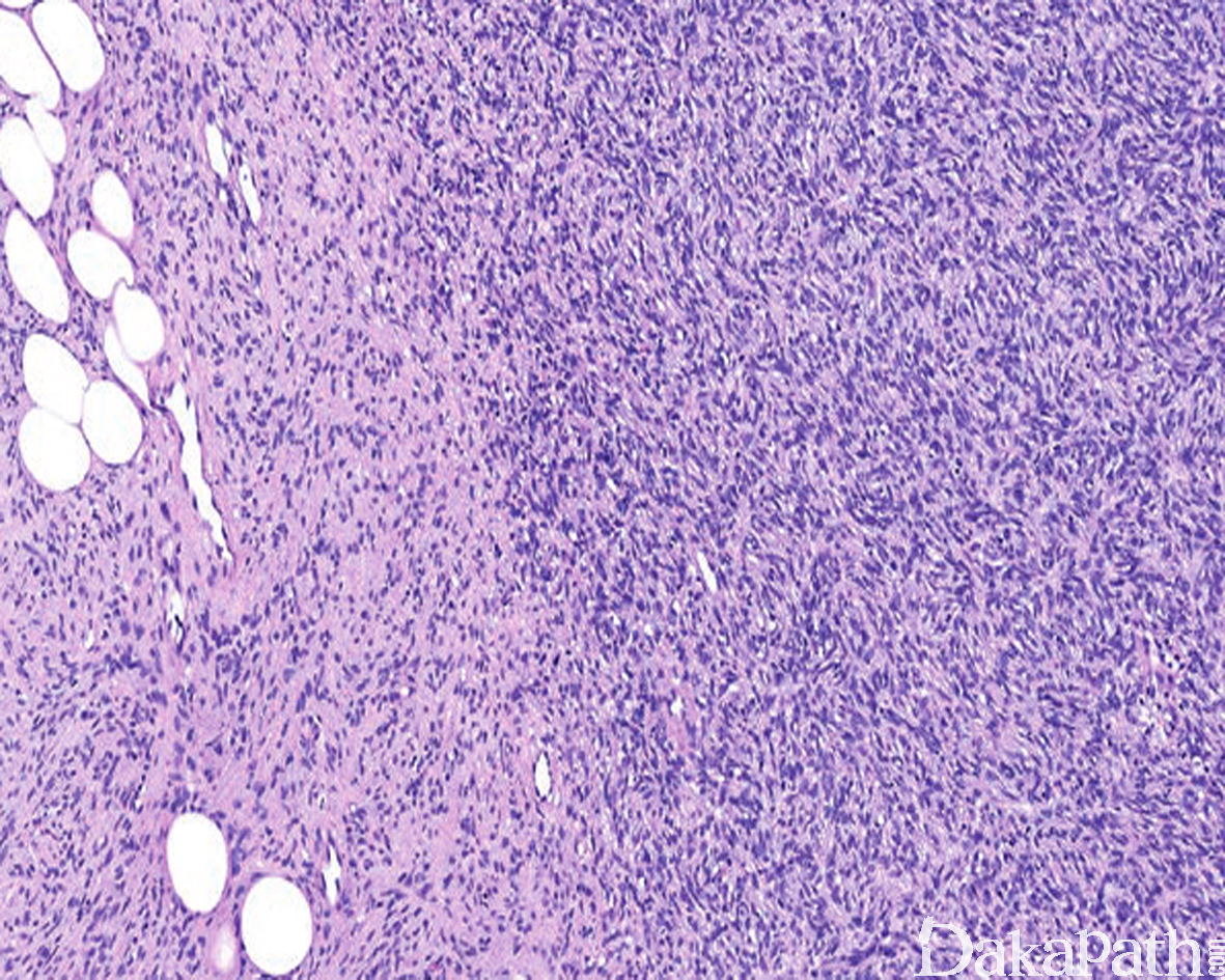 成人型纤维肉瘤:非常罕见,从前诊断的成年型纤维肉瘤现在多为其他类似的软组织肉瘤,其中较多为纤维肉瘤样转化的 DFSP,广泛取材寻找典型的 DFSP 灶可资鉴别;