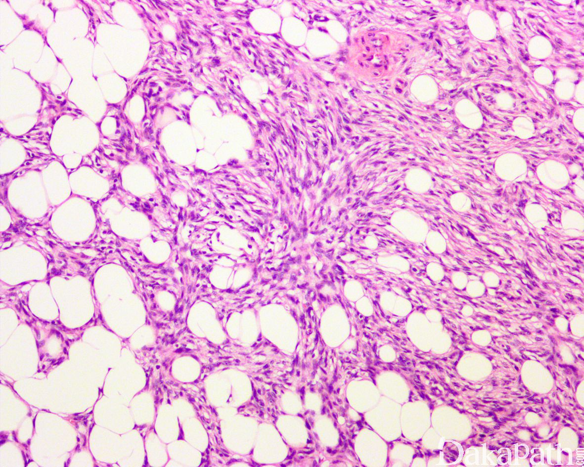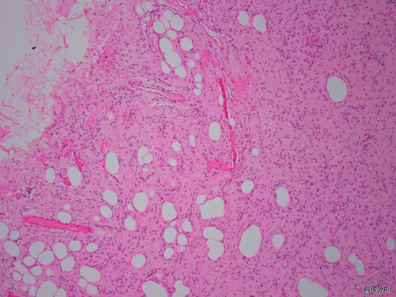 黏液脂肪肉瘤:粘液变异型 DFSP 亦需要与黏液性脂肪肉瘤区别;黏液脂肪肉瘤多位于皮下或肌内,罕见累及真皮,病变内可见复杂的鸡爪样血管网,瘤细胞呈卵圆形,可见单泡或多泡状脂肪母细胞,免疫组化染色表达 S100 蛋白;