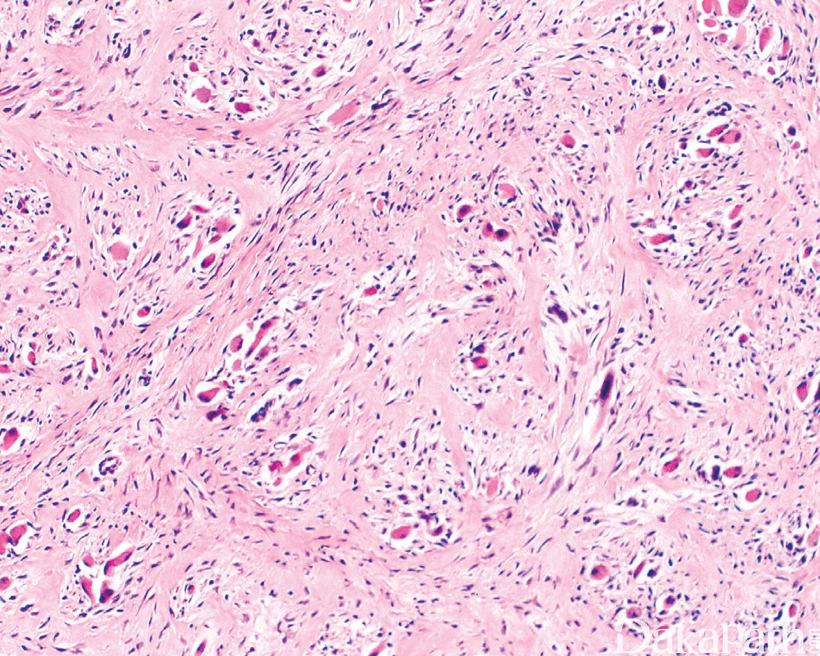 1. 韧带样纤维瘤病 :束状结构更明显,可见纤细的血管,斑驳状肥大细胞浸润,免疫组化染色核表达 b-catenin。
