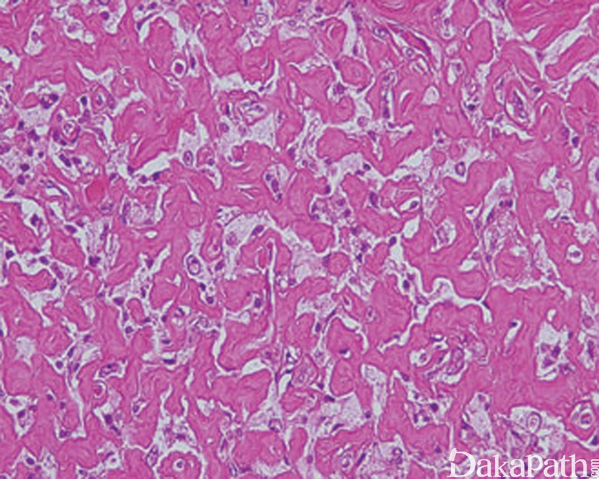 间质呈玻璃样变性,似疤痕疙瘩样或骨样机制样。