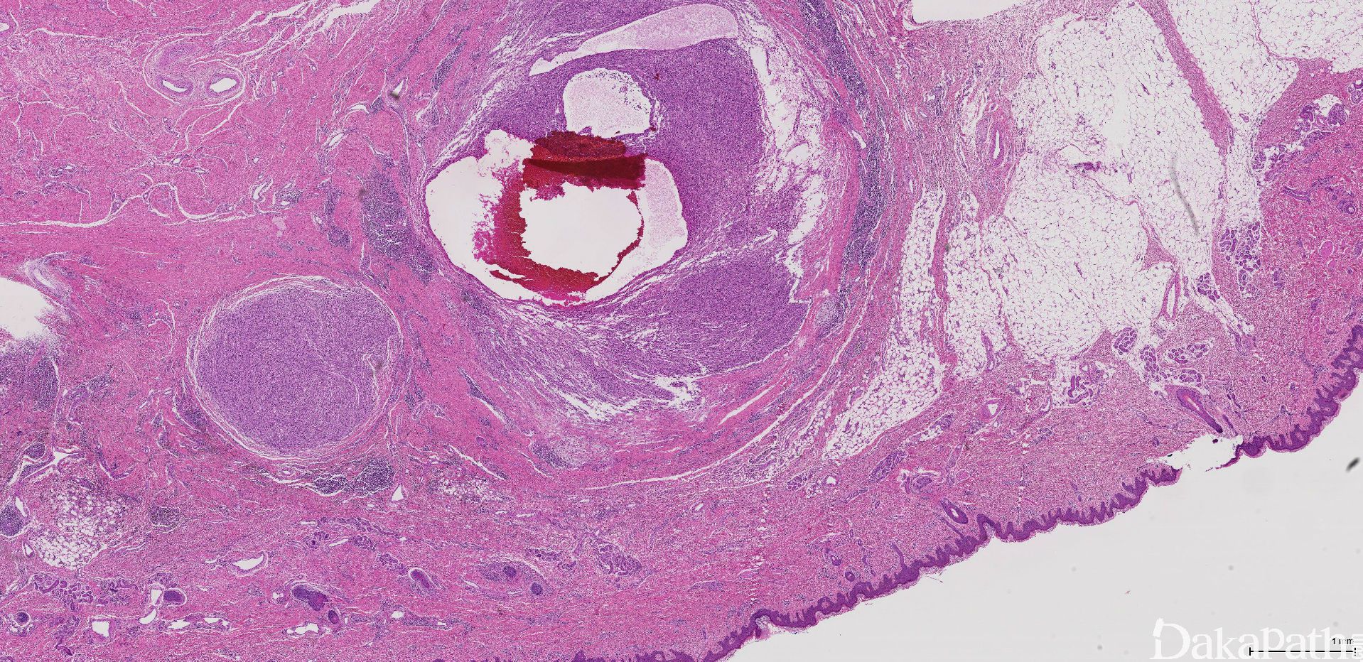 是一种好发于儿童和青少年四肢的浅表性肿瘤,主要有 4 中组织形态成分:合体细胞样梭形细胞结节伴多少不等的组织细胞、由肿瘤细胞围绕的假血管瘤样腔隙内充满血液(无内皮细胞衬覆)、厚的假纤维性包膜伴含铁血黄素沉积、包膜外淋巴浆细胞套偶伴生发中心。