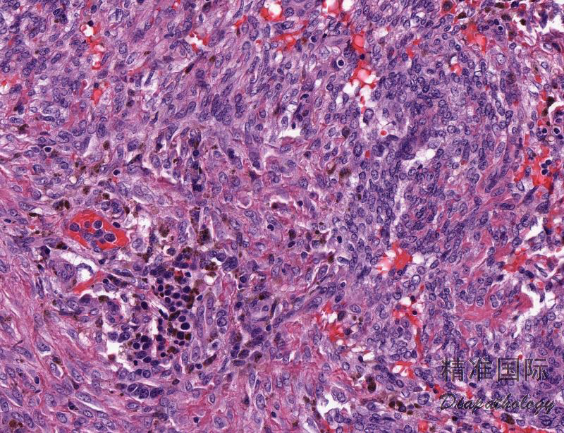 细胞胞质呈淡嗜伊红色,常含有含铁血黄素性颗粒,核染色质细致,可见核分裂像,一般不超过 5/10HPF;