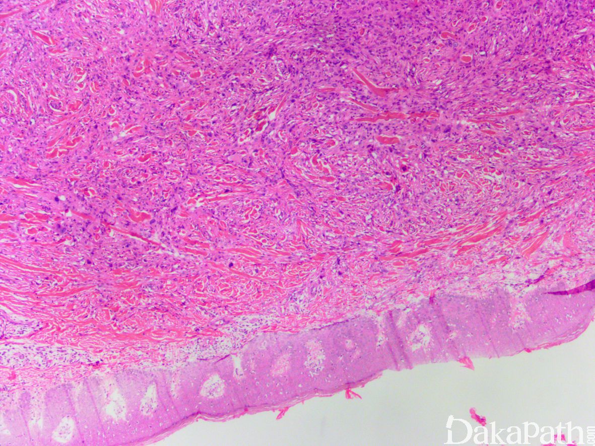隆凸性皮肤纤维肉瘤:瘤细胞以皮下生长为主,单调一致的席纹状瘤细胞呈蜂窝状累及皮下脂肪,发生纤维肉瘤样转化时可表现为多形性瘤细胞,免疫组化染色表达 CD34