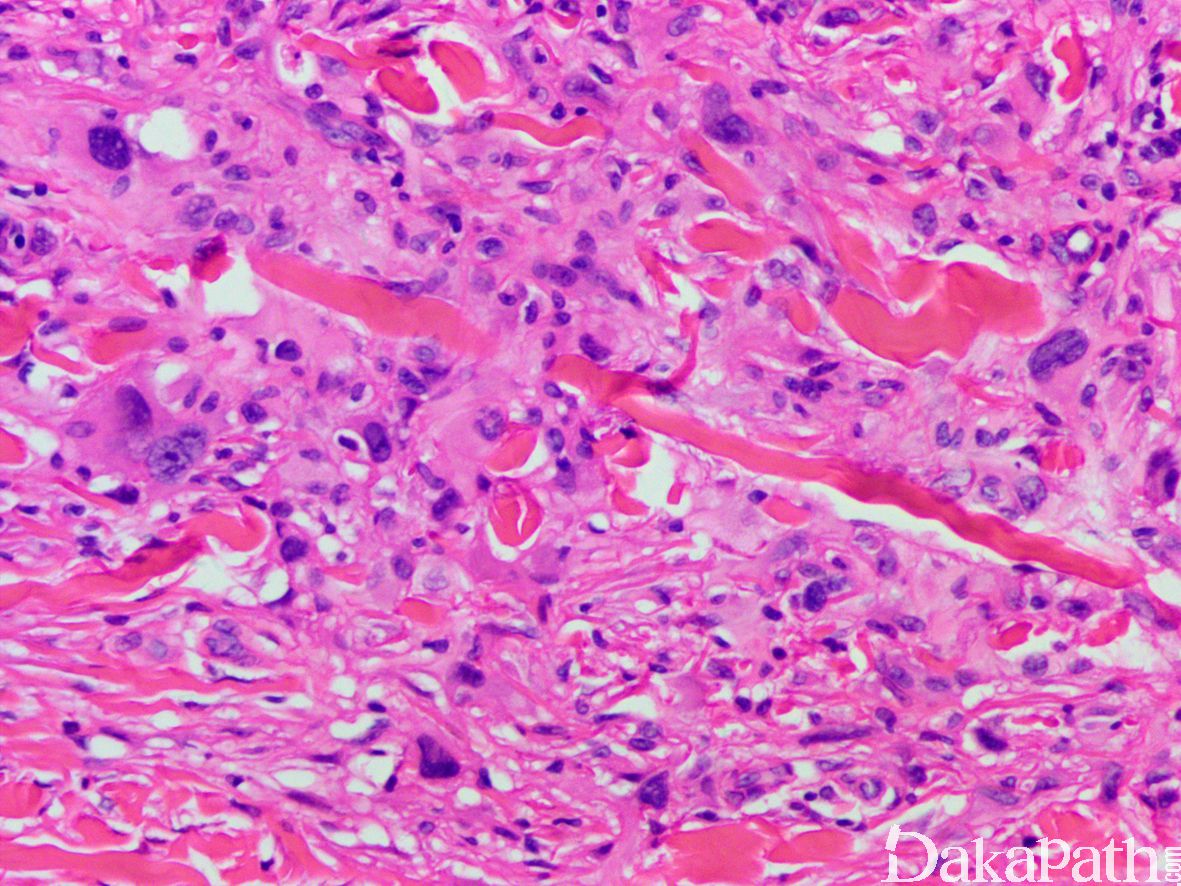 多形性瘤细胞可见多少不等的核大深染、核形规则的多形性细胞或畸形细胞,胞质嗜伊红色或泡沫样,有时可含有含铁血黄素,核分裂多少不等(1-15 个/10HPF),多数比较少见,偶尔可见非典型核分裂象和坏死;