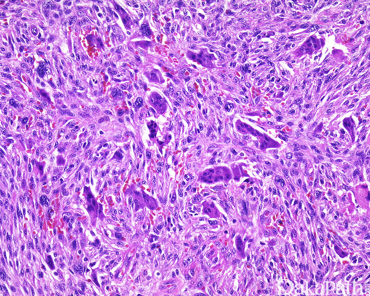 部分病例可完全由条束状排列的梭形细胞组成,瘤细胞并无明显的多形性,也可以上皮样细胞为主;