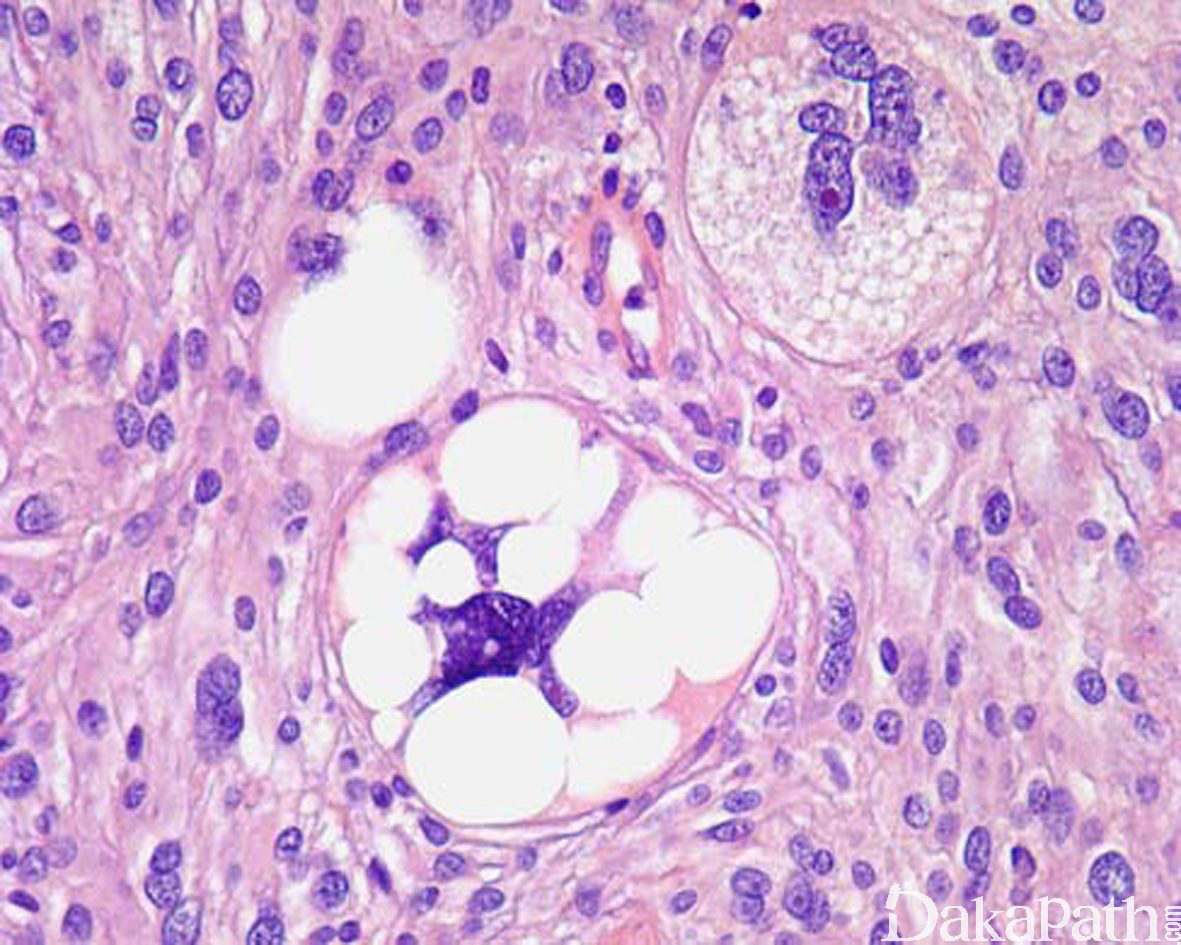 2. 属于多形性脂肪肉瘤的组织学亚型,病变完全或大部分由成片的上皮样细胞组成,上皮样细胞的胞质丰富,呈不同程度的嗜伊红染色,部分区域呈明显空泡状,细胞周界清晰,细胞之间的基质稀少,形成类似蜂窝状的结构,核级别高,分裂象活跃;类似于低分化癌或透明细胞肾细胞癌;