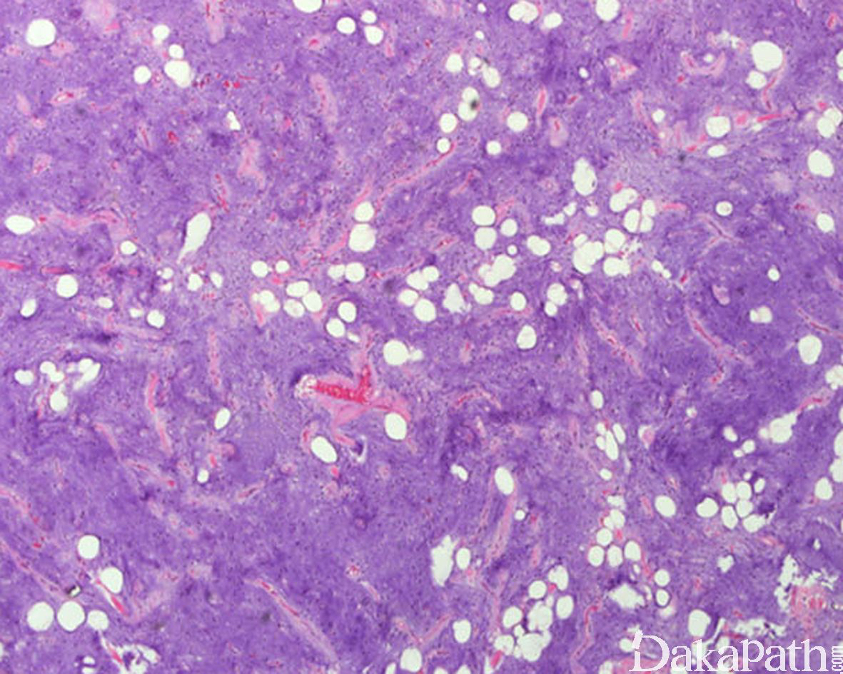 镜下由稀疏的短梭形或星状细胞混杂多少不等的成熟脂肪细胞组成;