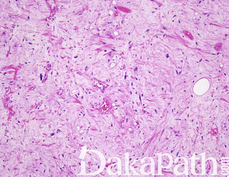 - 多数病例的平滑肌样成分中可见厚壁的血管,血管壁内可见核深染的异型大细胞,而在血管壁的周围常可见呈同心圆状排列的增生平滑肌细胞,与肿瘤内的平滑肌条束或结节之间在形态上有过渡或移行。
