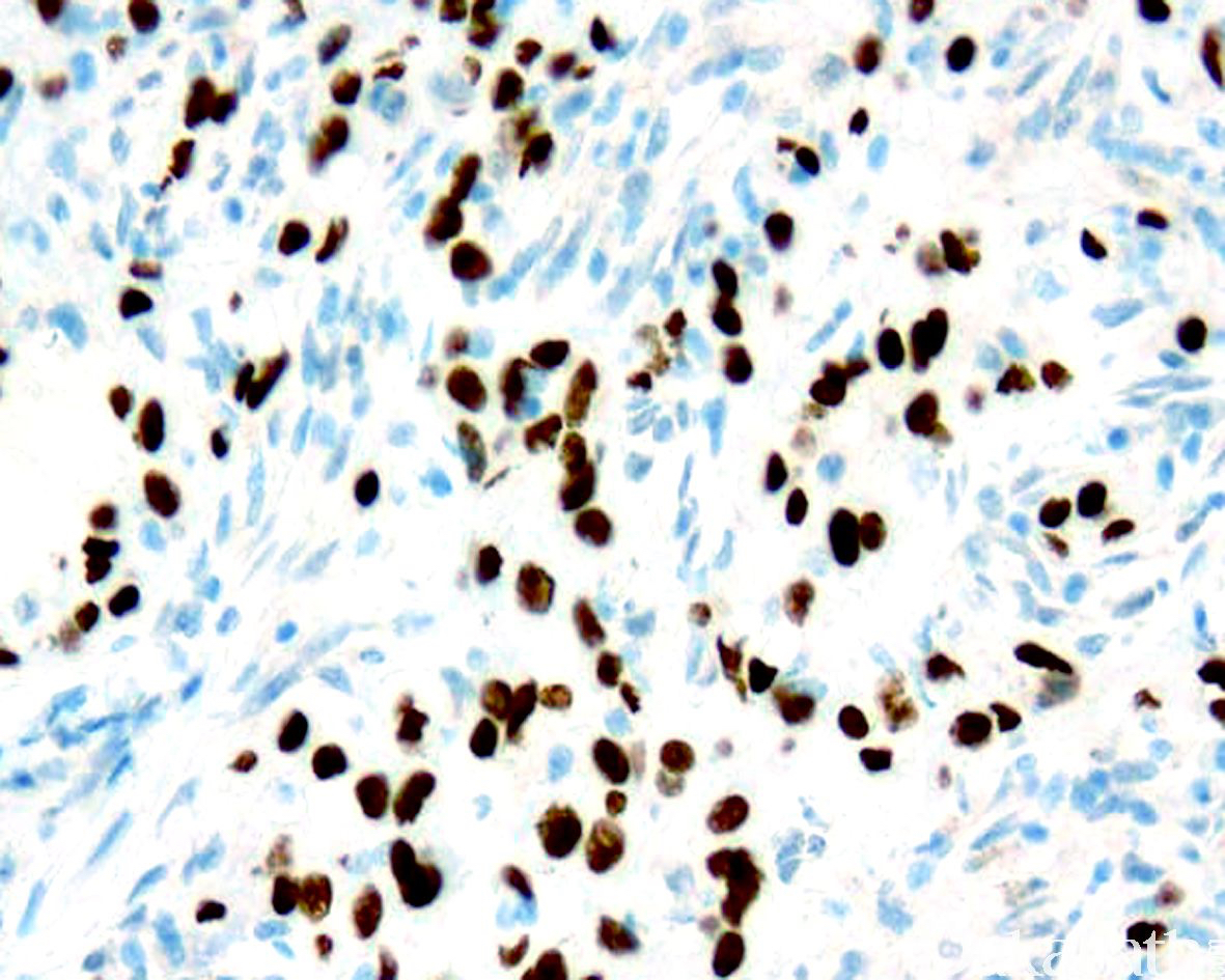 肿瘤细胞表达 ERG,CD34,CD31,Fli-1(诊断 EHE 至少需要 1 个以上的血管内皮细胞标志物阳性),约 25%的 EHE 表达 CK(局灶或弥漫),一般不表达 EMA,部分可表达 D2-40, 约半数可表达 SMA;伴有 WWTR1-CAMTA1 基因融合的 EHE(约 85%-90%)弥漫核表达 CAMTA1, 伴有 YAP1-TFE3 基因融合的 EHE(< 5%)弥漫核表达 TFE3,但 TFE3 阳性对于诊断 YAP1-TFE3 融合的 EHE 并不特异,需要 FISH 证实,因少数伴有 WWTR1-CAMTA1 基因融合的 EHE 亦可表达 TFE3