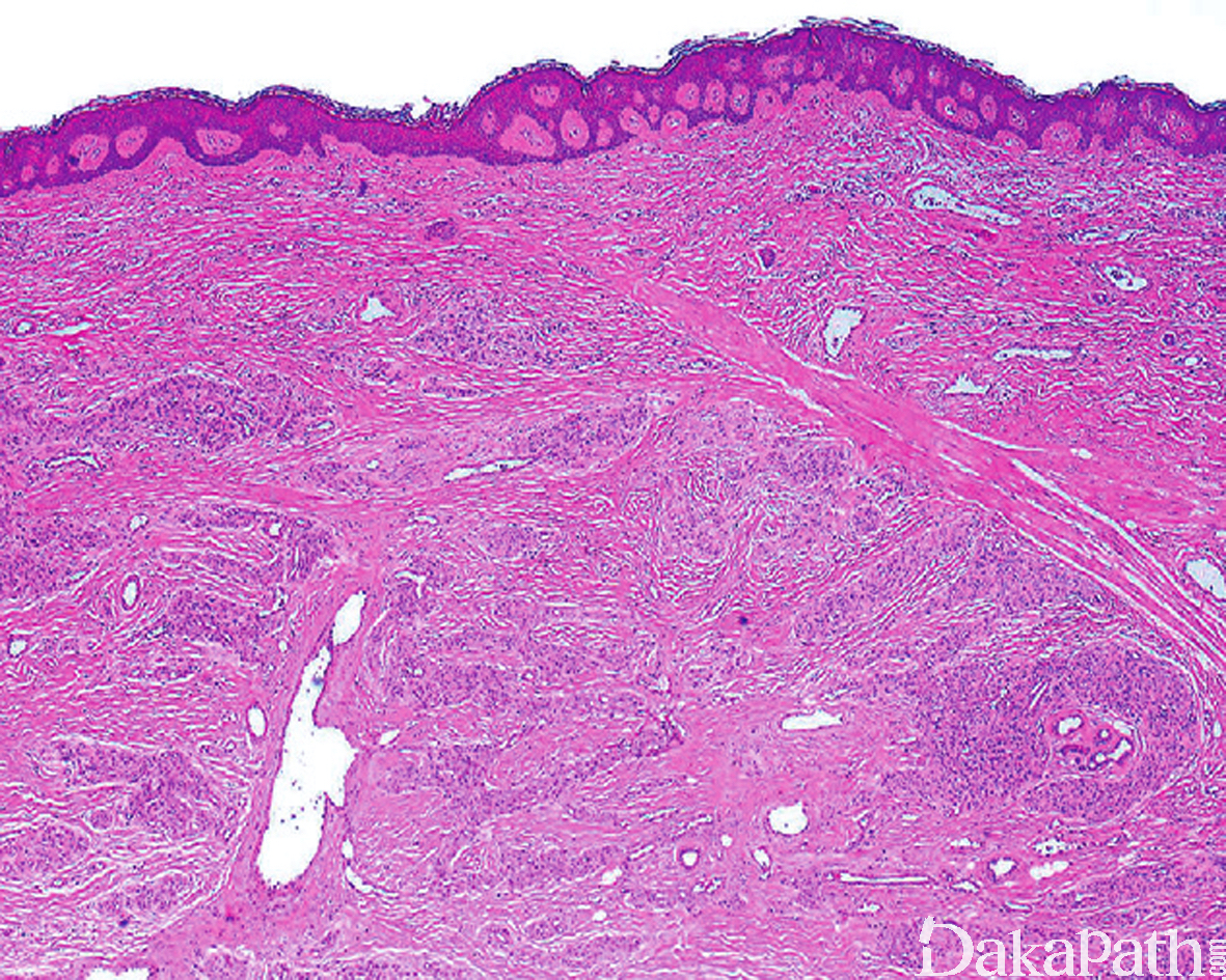 - 大多数病例间质内可见含铁血黄素性沉着及慢性炎症细胞浸润,真皮的间质常见筋膜炎样反应性增生。