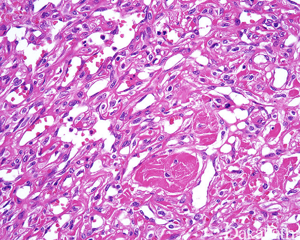 - 簇状增生的毛细血管排列紧密,内皮无明显的异型性,无复层内皮细胞增生表现,部分病例内皮可呈上皮样,内皮的周围均可见增生的周皮细胞;