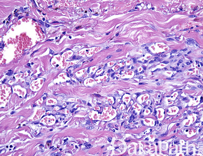 - 少数病例血管分割胶原纤维,但血管腔内无乳头状突起;