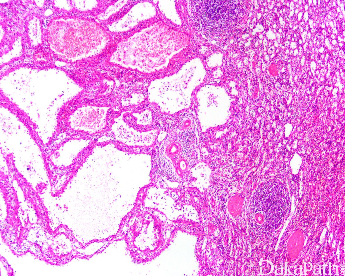 - 血管腔不规则,部分囊状扩张伴突向血管腔的具纤维性间质轴心的乳头结构,其表面衬覆单层内皮细胞;