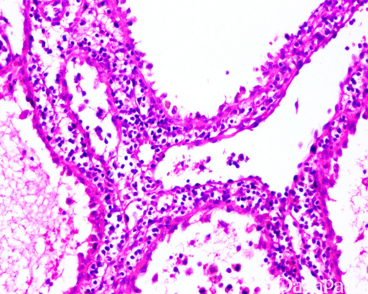 - 内皮扁平或高柱状,常脱落至血管腔内,常见吞噬红细胞现象或含铁血黄素,可呈泡沫样;