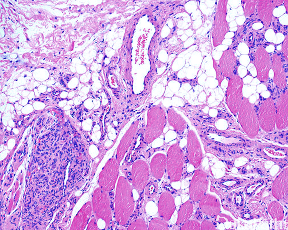 镜下:肌内血管增生,常界限不清, 周围骨骼肌组织常伴有成熟脂肪化生;