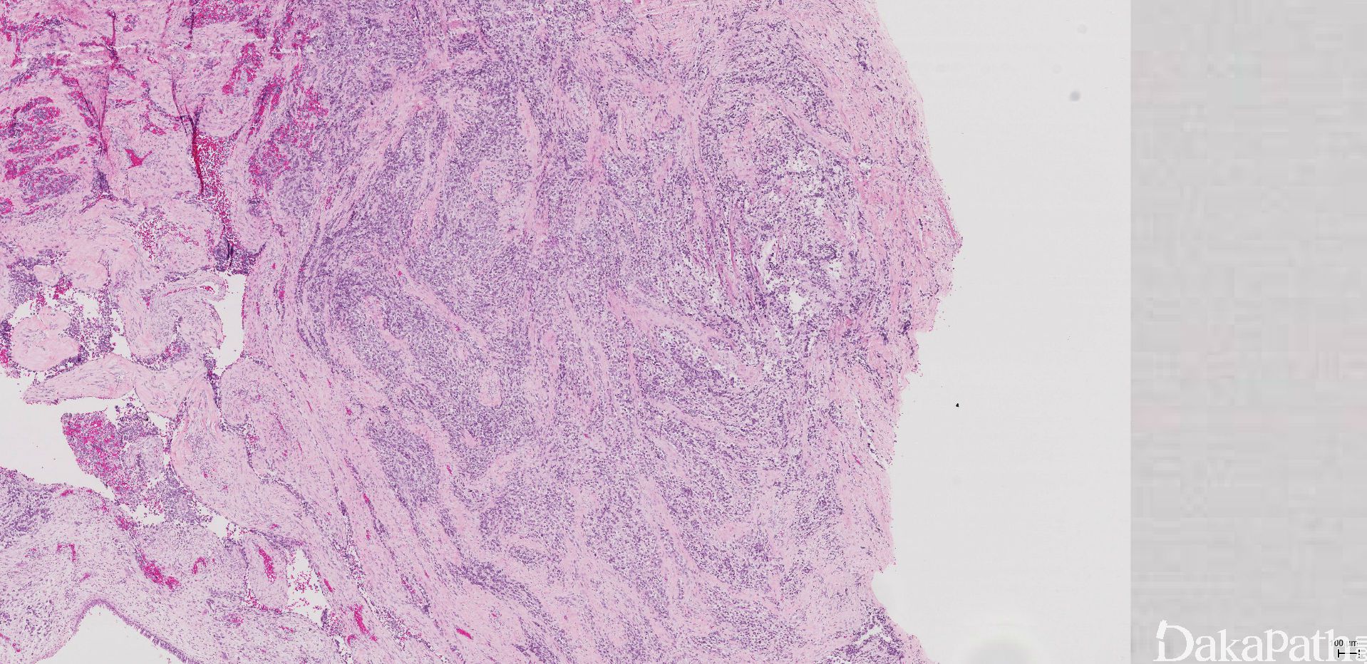 1. 鼻窦未分化癌 (SNUC)  高级别,具有广泛破坏性,大量凝固性坏死及血管浸润,弥漫角蛋白强阳性,可显示少量神经内分泌标记。