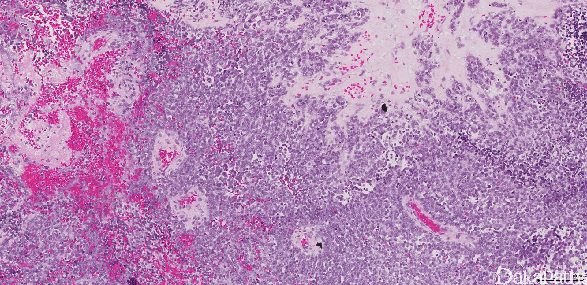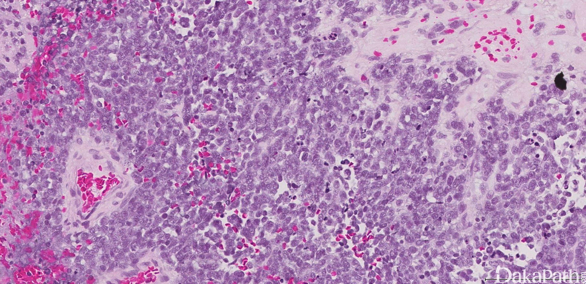 4. 肿瘤细胞呈经典小圆蓝细胞,比成熟淋巴细胞稍微大一些,核浆比高,小而一致的胞核伴细致、椒盐样染色质分布,胞核比较小或缺席。细胞呈合胞体样。可见中央为神经丝状物构成的菊形团(Homer Wright)。