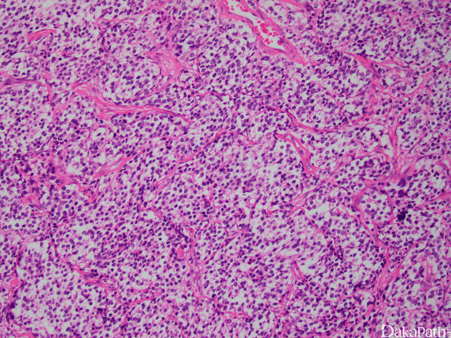 3. 组织学改变基于分化成程度不同而呈不同,原始神经母细胞分叶状排列(不管分级如何)。叶状结构之间富于纤维血管间隔,支持细胞常位于细胞巢周边。