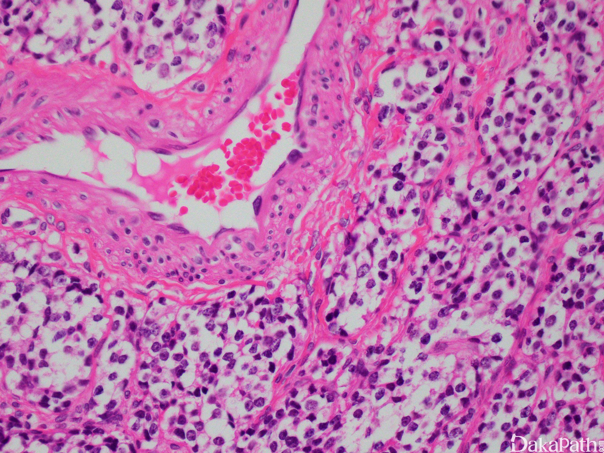 7. 可见两种菊形团形式:假菊形团  (Homer Wright)及真菊形团(Flexner-Wintersteiner)。假菊形团见于 30%的病例,肿瘤细胞栅栏状、套样围绕在神经丝样、水肿样神经基质的周围,可见于 1 级或 2 级。真菊形团见于 5%的病例,中空导管样伴非纤毛样柱状细胞,可见与 3 级或 4 级。围血管性菊形团没有诊断价值。