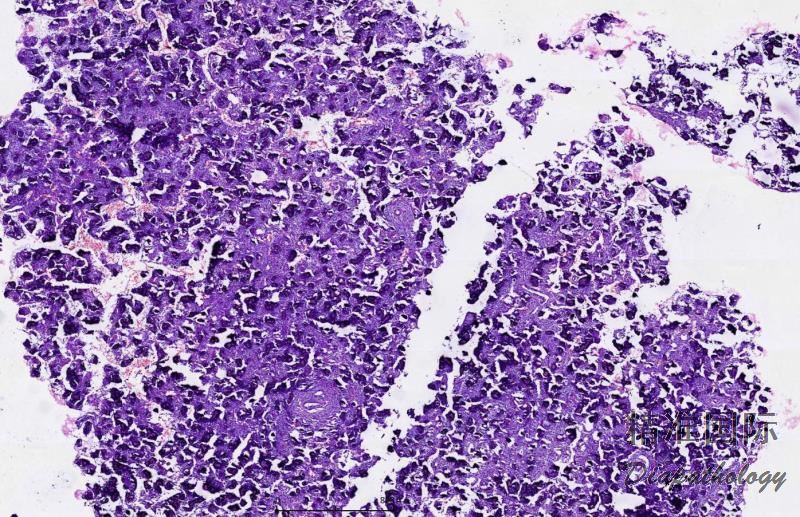 嗅觉神经母细胞瘤 (Olfactory Neuroblastoma):发生在筛状板,结节状生长,胞浆稀少的小肿瘤细胞,神经丝背景,菊形团/假玫瑰花环样结构。
