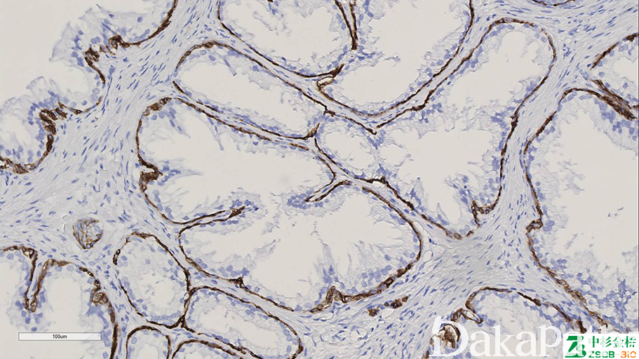 高分子量角蛋白,与细胞角蛋白 1、5、10、14 反应。表达于鳞状上皮、腺体基地细胞等细胞的胞质