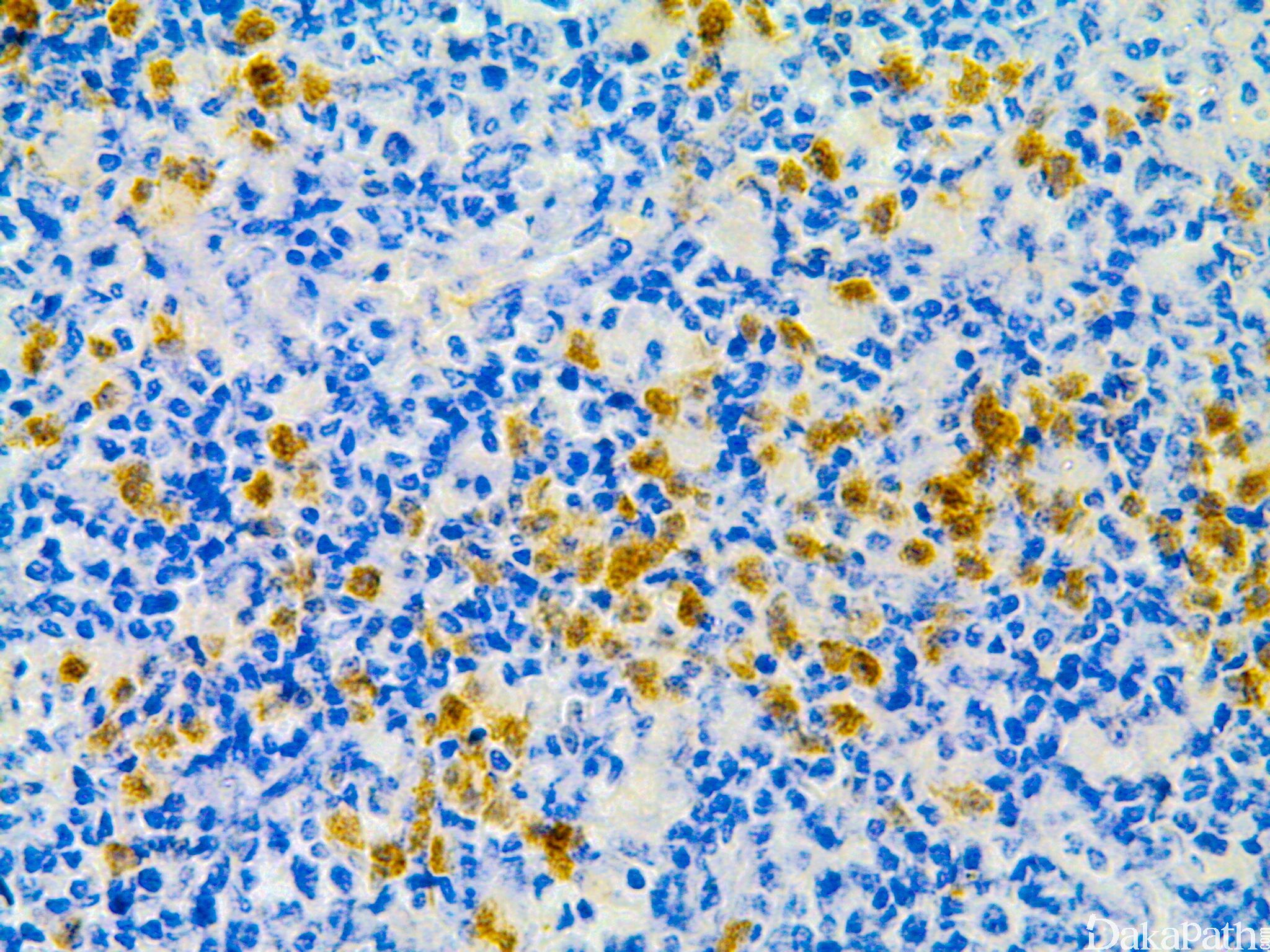 少数阳性(<35%,≥15%的病例阳性): 急性髓系白血病,NOS、经典型霍奇金淋巴瘤、急性髓系白血病(M2)、淋巴细胞消减型经典型霍奇金淋巴瘤、混合细胞型经典型霍奇金淋巴瘤、结节硬化型经典型霍奇金淋巴瘤
