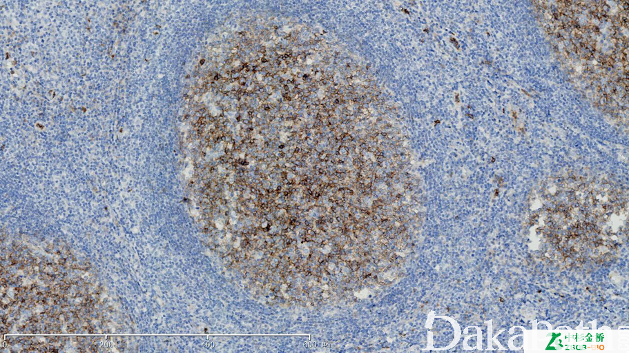 淋巴造血细胞肿瘤中主要标记急性 B 淋巴母细胞白血病/淋巴瘤、血管免疫母细胞性 T 细胞淋巴瘤、生发中心源性淋巴瘤;