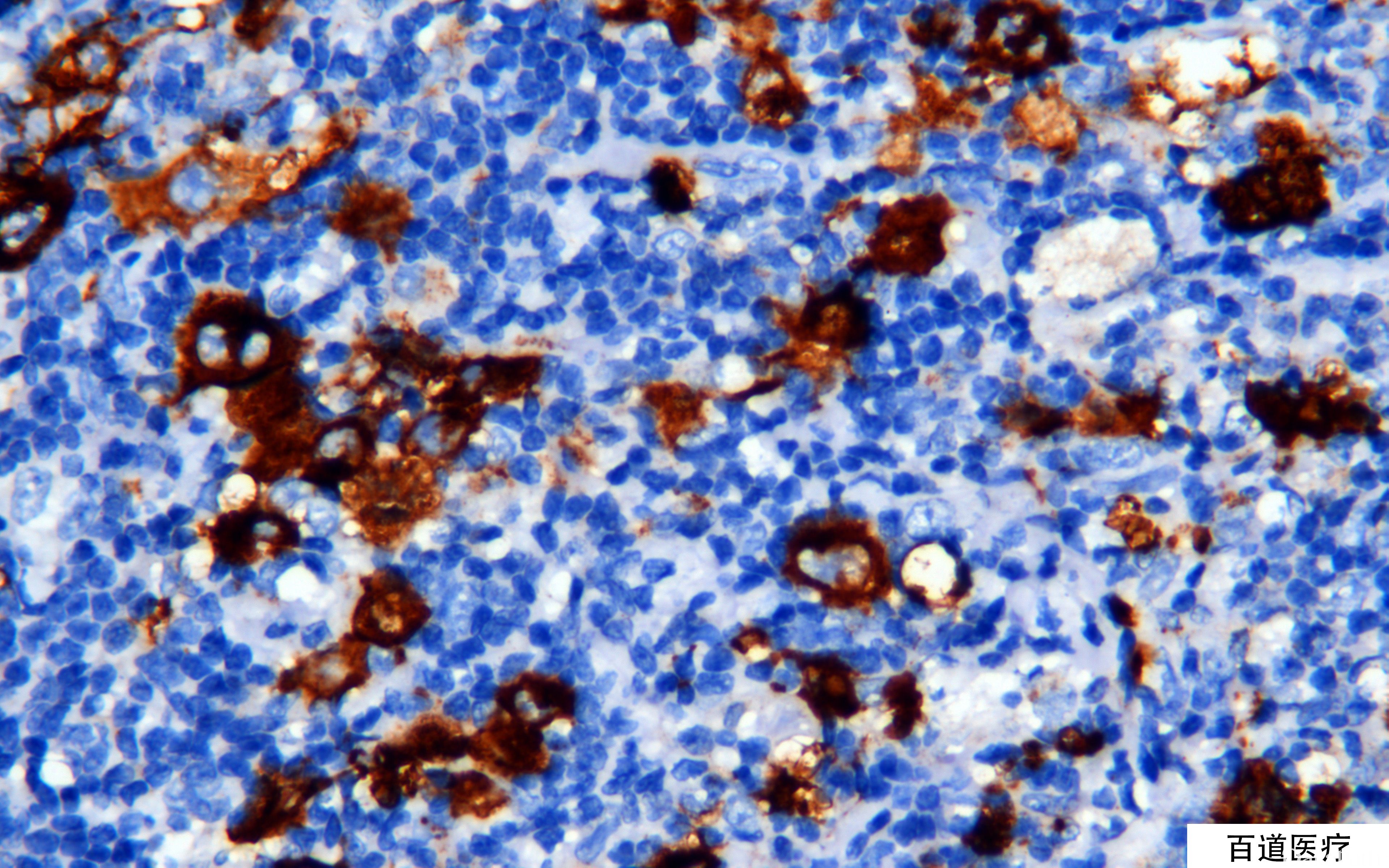 是一种碳水化合物,标记何杰金 R-S 细胞,髓细胞白血病/肉瘤(是相对成熟髓细胞的标记物; CD117 标记相对幼稚的髓细胞,而 MPO 是相对广谱的髓细胞标记物)。腺癌阳性,可用于与间皮瘤( -)鉴别,但效果不如 BerEP4 等其它腺癌标志物。