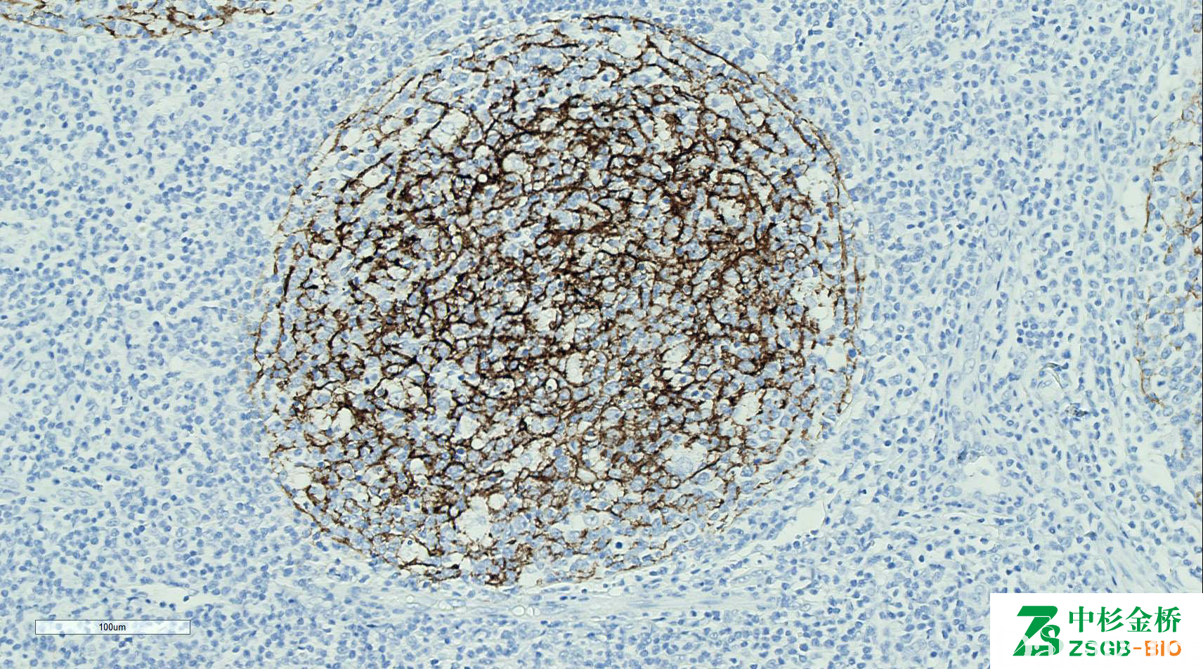 树突细胞标记物,是 EBV 及 HHV8 等病毒受体,表达于滤泡树突细胞、边缘区细胞及套细胞,用于显示生发生心轮廓。