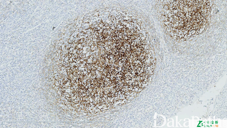 显示滤泡树突网(脾脏边缘区淋巴瘤滤泡树突网消失)。
