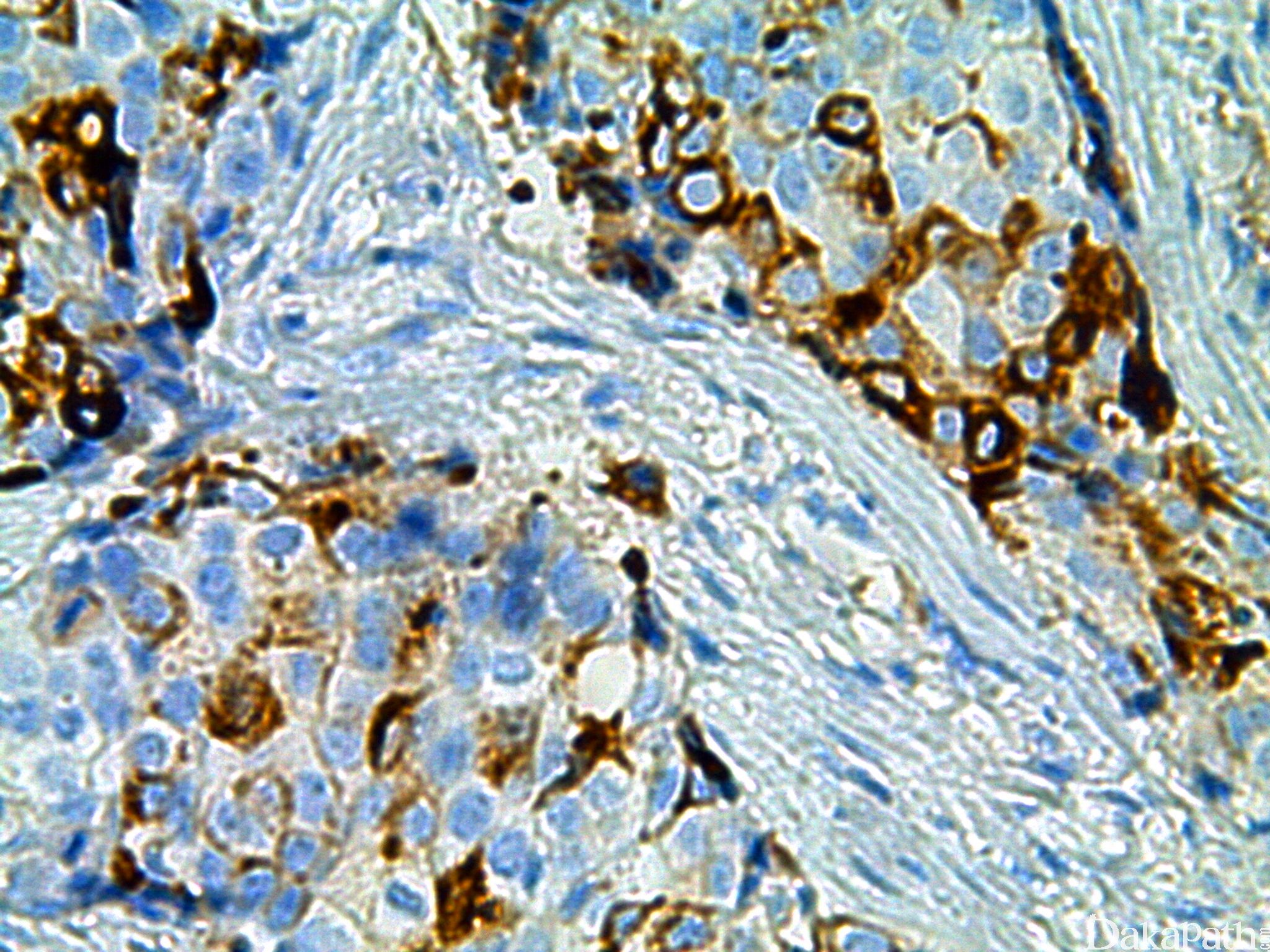 有时阳性(<55%,≥35%的病例阳性): 涎腺导管腺癌、涎腺腺泡细胞癌、乳腺浸润性微乳头状癌、乳腺 Paget 病、乳腺浸润性癌,非特殊类型、乳头旺炽性乳头状瘤病、肺黏液表皮样癌、肛周 Paget 病伴直肠腺癌