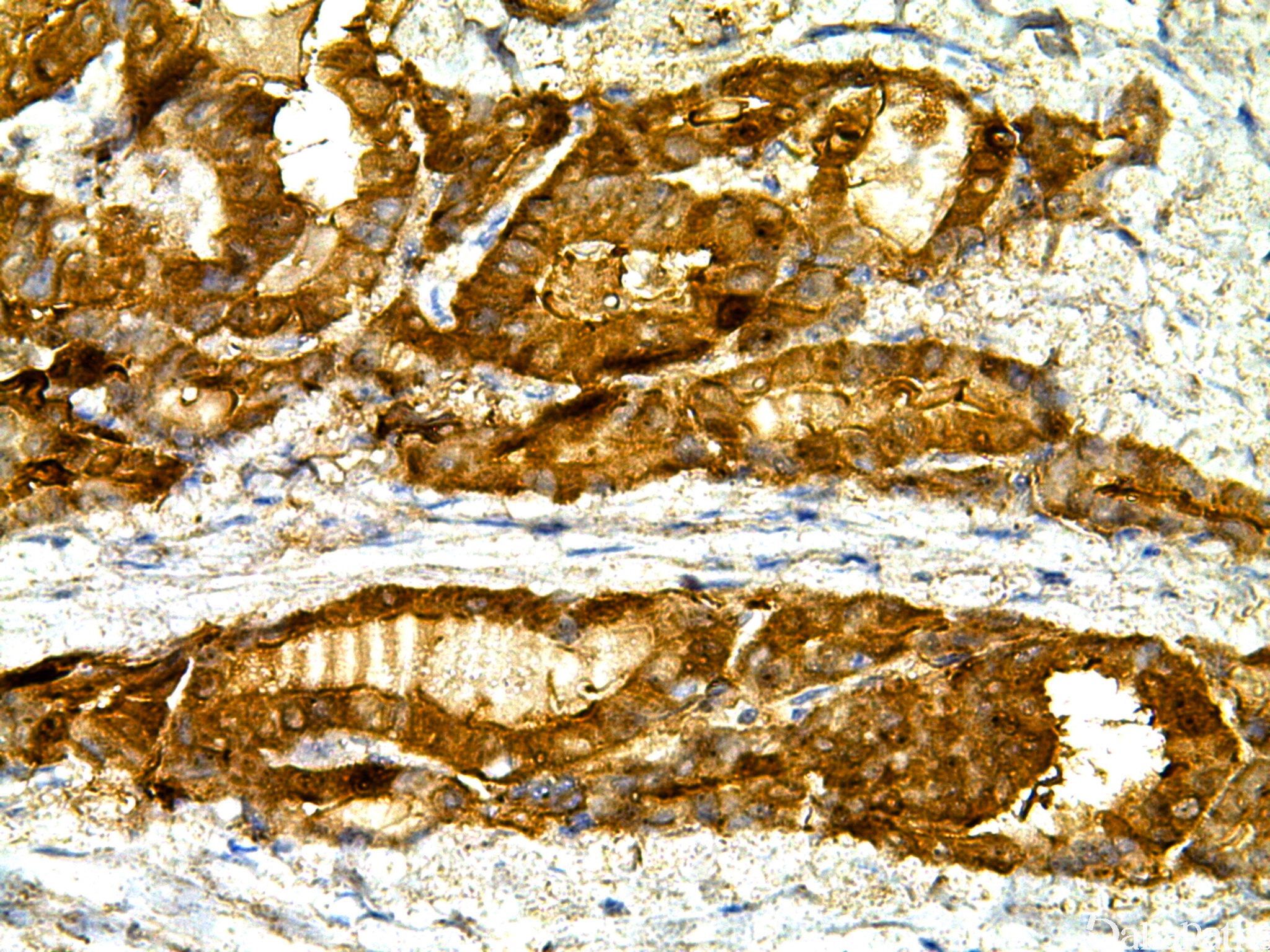 通常阳性(<95%,≥75%的病例阳性): 肾嫌色细胞癌、平滑肌肉瘤,NOS、甲状腺乳头状癌、腺样囊性癌、肺鳞状细胞癌、室管膜瘤、甲状腺腺瘤、甲状腺滤泡型乳头状癌、多形性胶质母细胞瘤、甲状腺岛状癌、甲状腺嗜酸细胞腺癌、甲状腺玻璃样变梁状肿瘤、甲状腺非典型腺瘤、肺腺癌