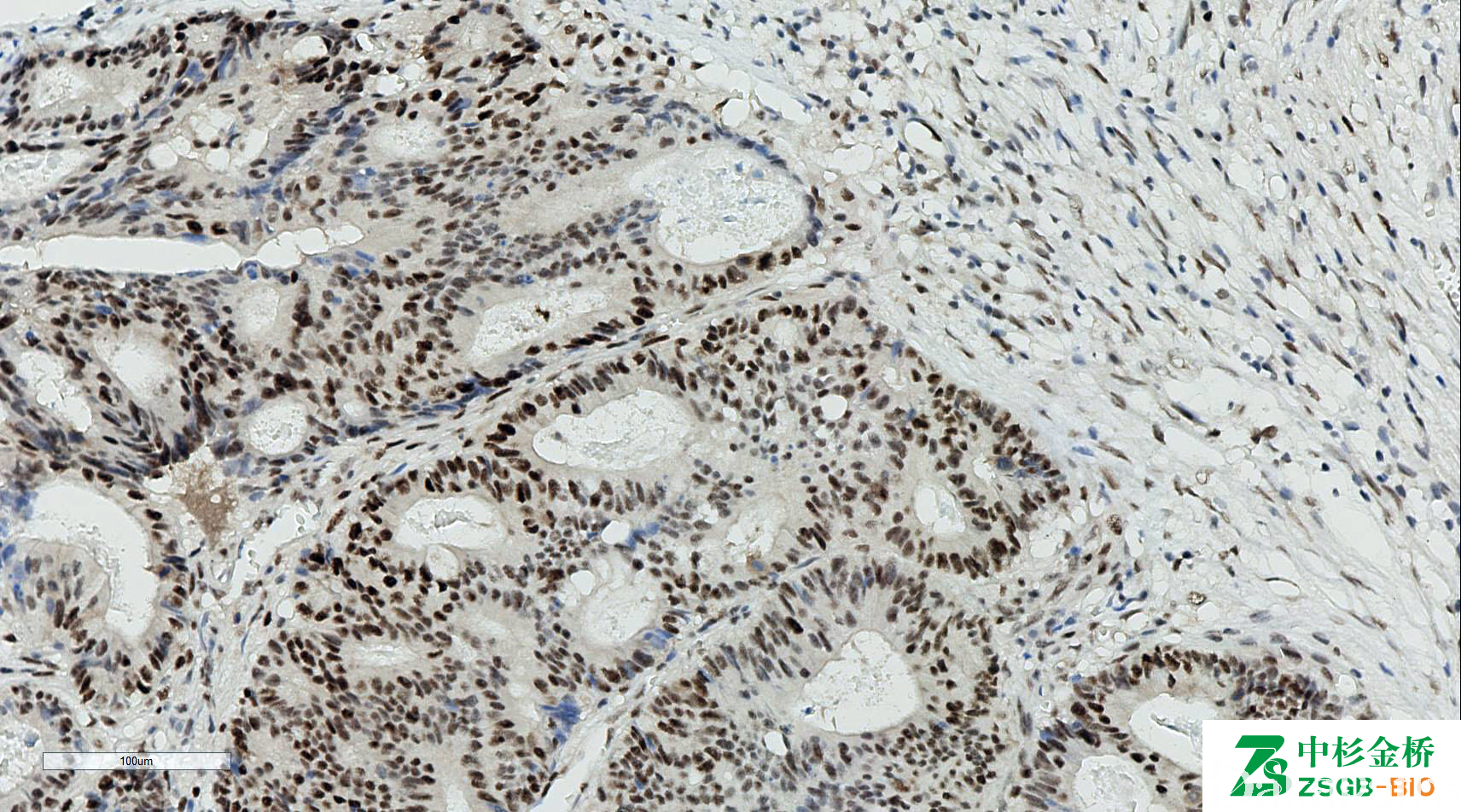 正常上皮、间质细胞和淋巴细胞均核(+);