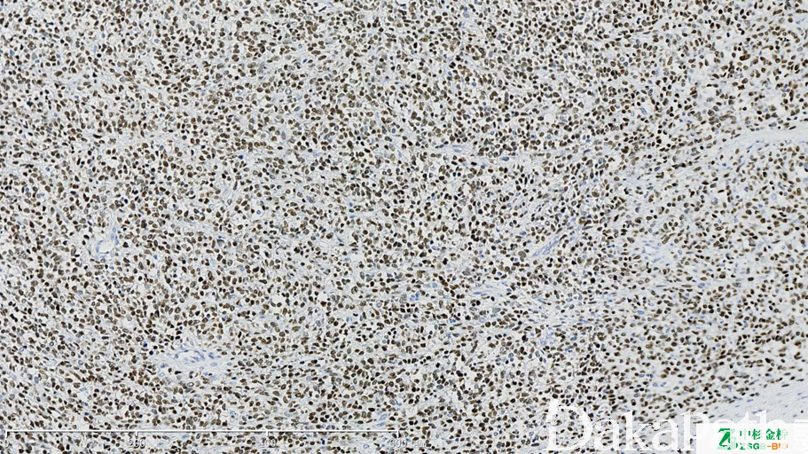 肌源性转录调节蛋白,表达于骨骼肌分化的早期,是横纹肌肉瘤的敏感性标记,仅表达于胚胎性横纹肌细胞中,正常横纹肌不表达。由于胞浆及非特异性背景染色致特异性不高。