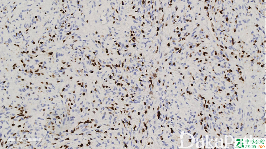 肌源性转录调节蛋白,仅在有横纹肌分化的细胞有表达且胞浆分化越明显的细胞表达越弱。