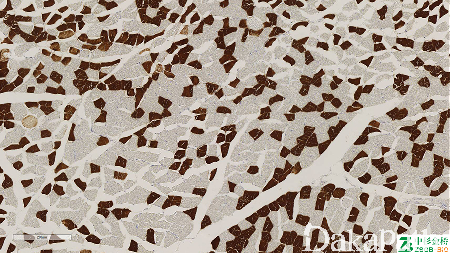 与骨骼肌肌球蛋白重链反应。对横纹肌肉瘤特异性强,但敏感性偏低,需与其它标记物联合使用。