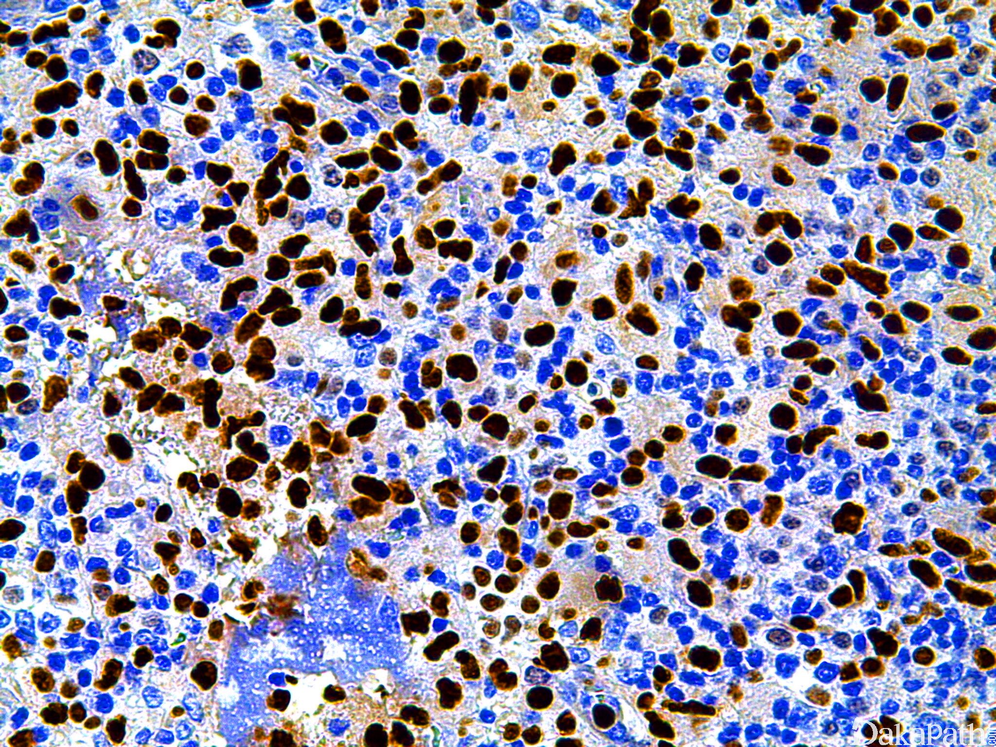几乎全部阴性(<5%的病例阳性): 经典型霍奇金淋巴瘤、淋巴细胞消减型经典型霍奇金淋巴瘤、混合细胞型经典型霍奇金淋巴瘤、结节硬化型经典型霍奇金淋巴瘤