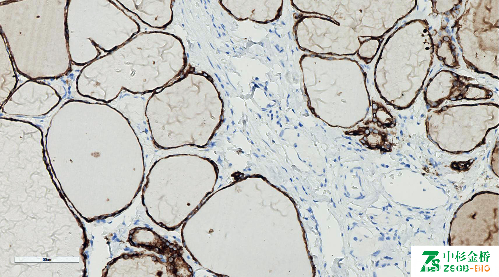 辅助甲状腺肿与甲状腺癌的诊断,在正常甲状腺及甲状腺良性病变中中广泛表达,甲状腺癌表达减低,但对区分甲状腺良恶性肿瘤特异性及敏感性均不高。